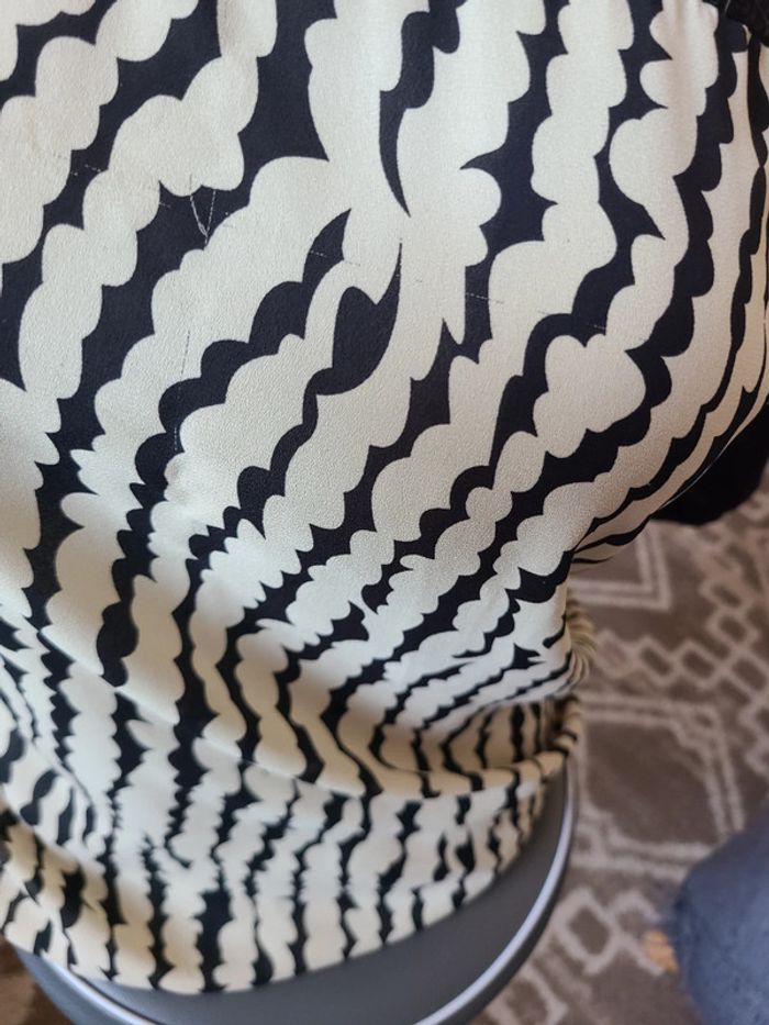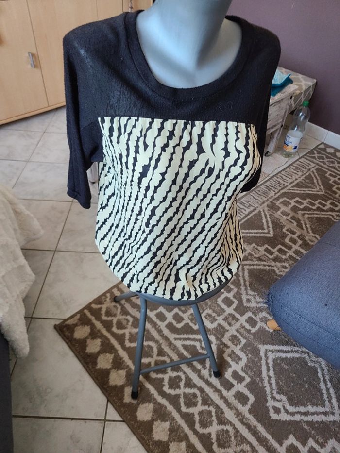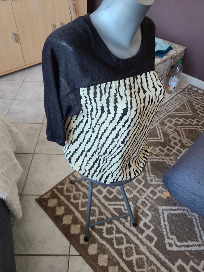 Top manches 3/4 noires et buste du top type polyester crème motif noir. En plutôt bon état, quelques petits fils tirés(voir photo). Taille pour du 38. Maison non-fumeur Envoi soigné #maddy71femme38 60 cm de long et 50 cm d'aisselle à aisselle.