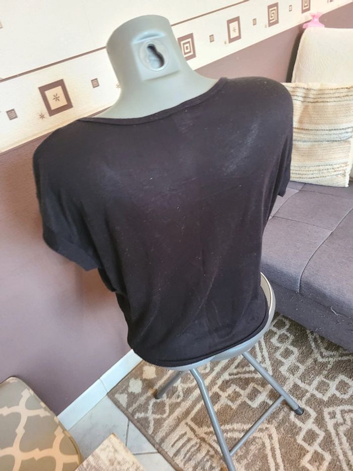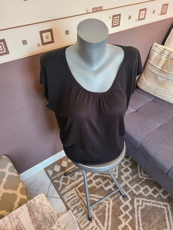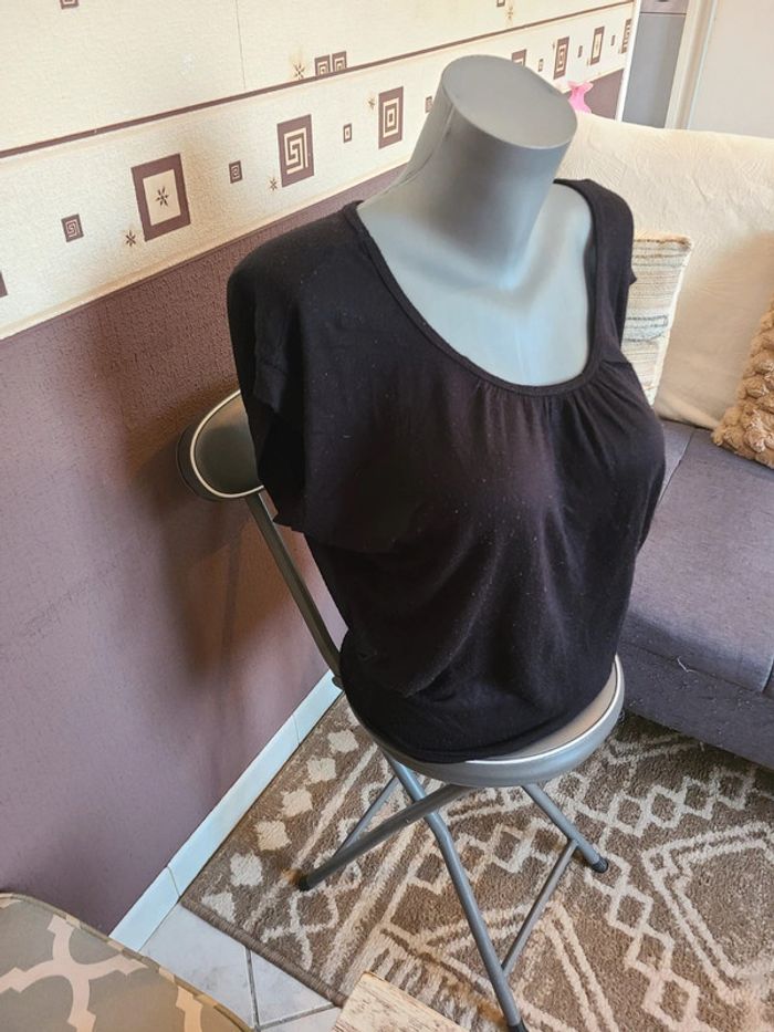 Top noir chauve-souris. Ample, léger et confort. 55 cm de long et idem d'aisselle à aisselle environ. En bon état, (voir photo) il bouloche léger à certains endroits. Maison non-fumeur Envoi soigné #maddy71femme36 #maddy71femme38ete #maddy71femme38