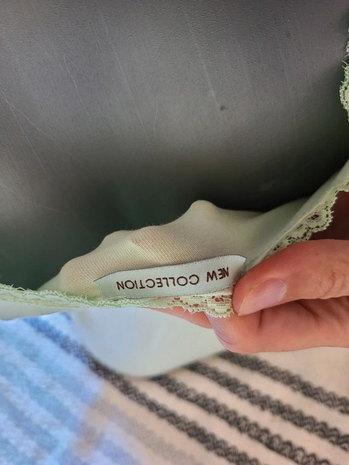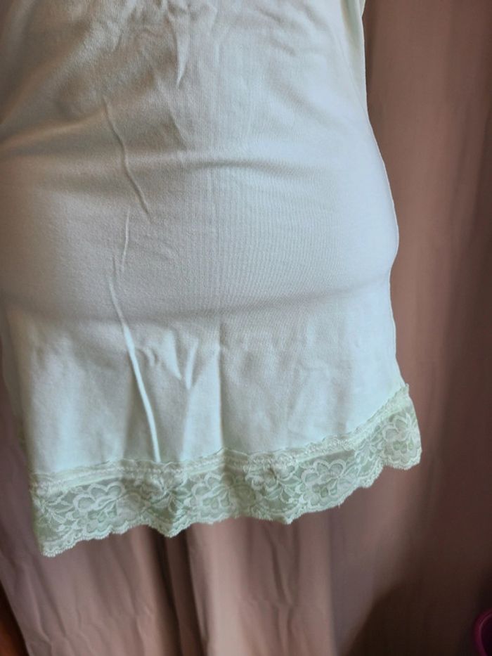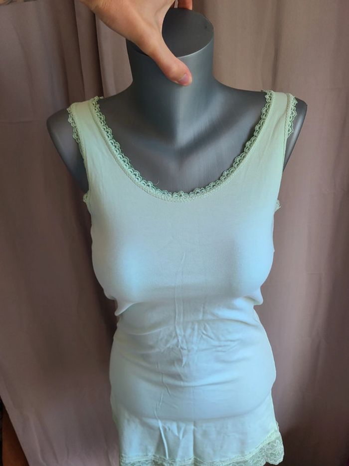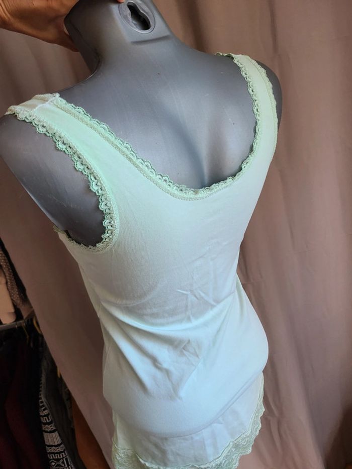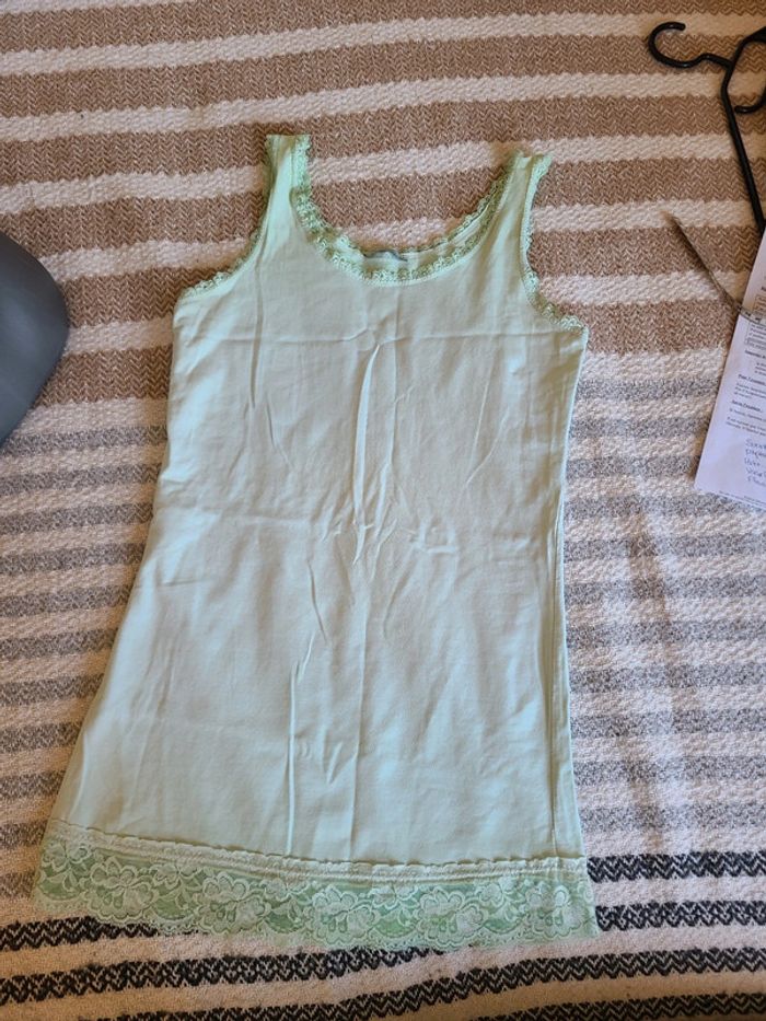 Debardeur long avec fausse dentelle. Vert clair, limite menthe. Matière élastique. En super état. 74 cm de long et 40 cm d'aisselle à aisselle. Maison non-fumeur Envoi soigné #maddy71femme38 #maddy71femme38ete