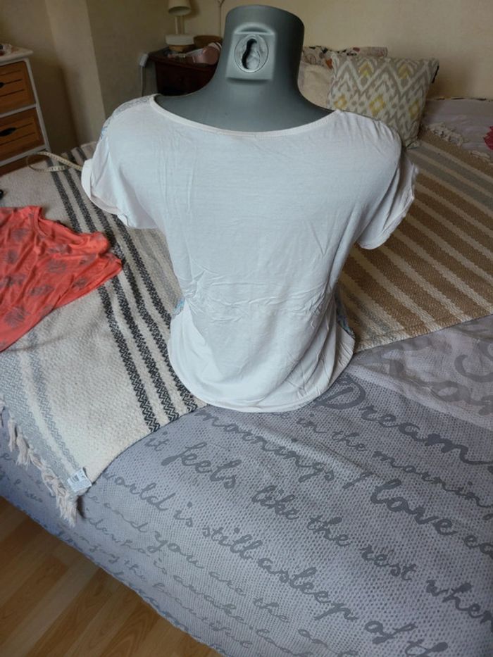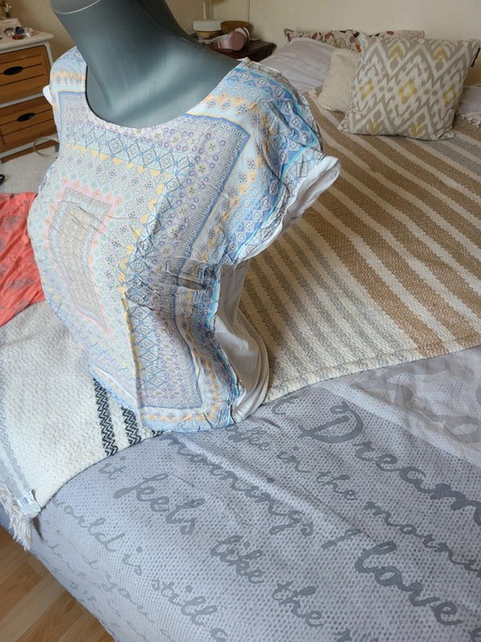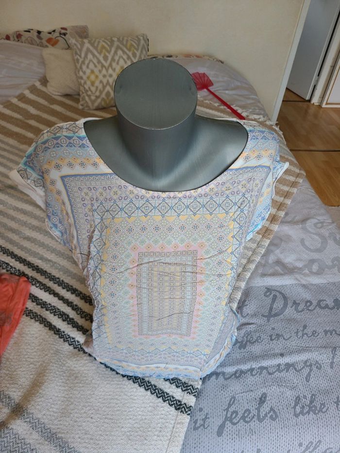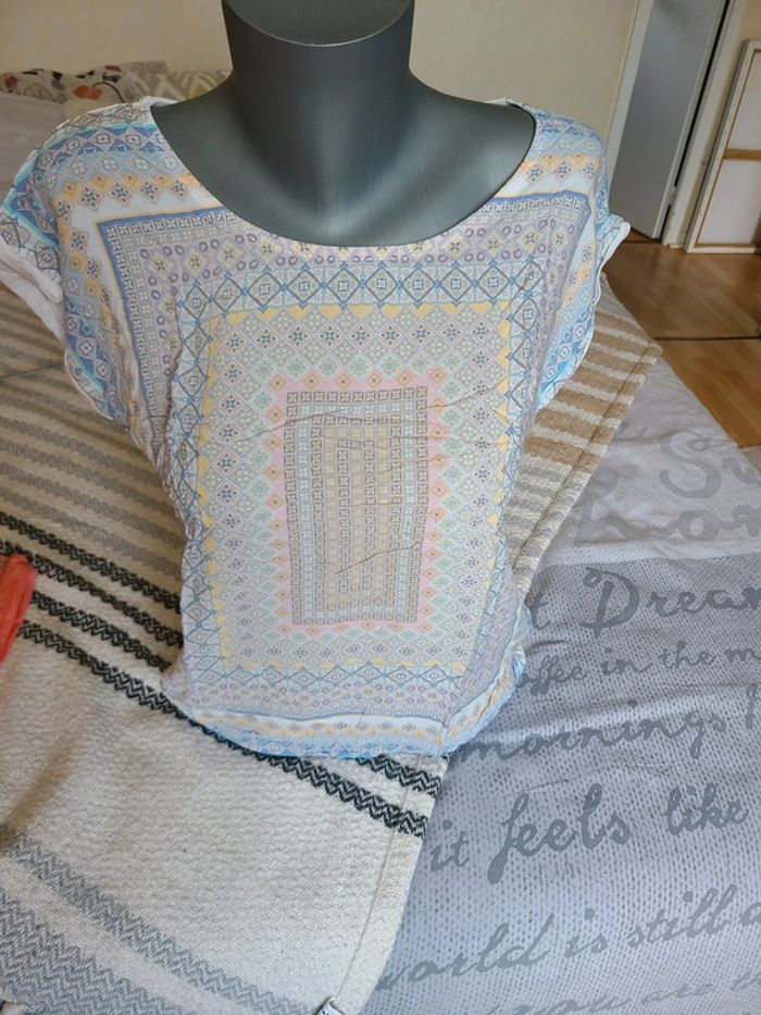 Top dans des tons très doux. Coupe plutôt en carré. Motifs ethniques très sympa. 55 cm de long par 48 cm d'aisselle à aisselle. En vraiment bon état. Maison non-fumeur Envoi soigné. #maddy71femme38ete #maddy71femme38