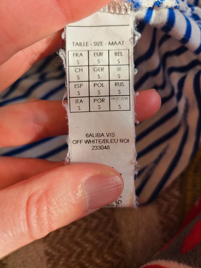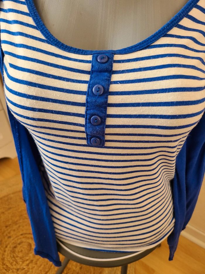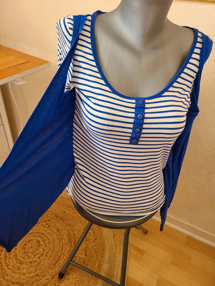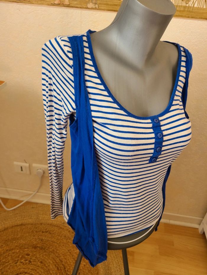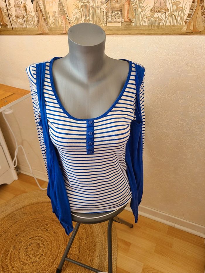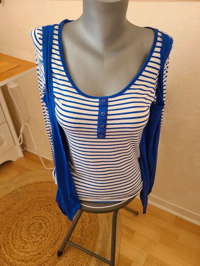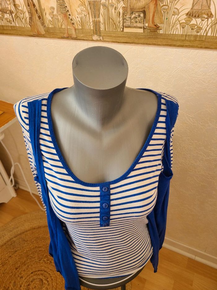 Joli top rayé bleu avec petit supplément bleu vif type jacket. C'est cousu dessus. Matière souple, confortable et extensible. 64 cm de long et 44 cm d'aisselle à aisselle. Conviendra à un 36 mais aussi moulant un 38. A été porté, donc laver. Reste en bon etat, mais le tissu a certains endroits comportent de petites bouloches dues aux lavages. J'aime a être transparente dans mes annonces.😊 Maison non-fumeur Envoi soigné #maddy71femme36 #maddy71femme38