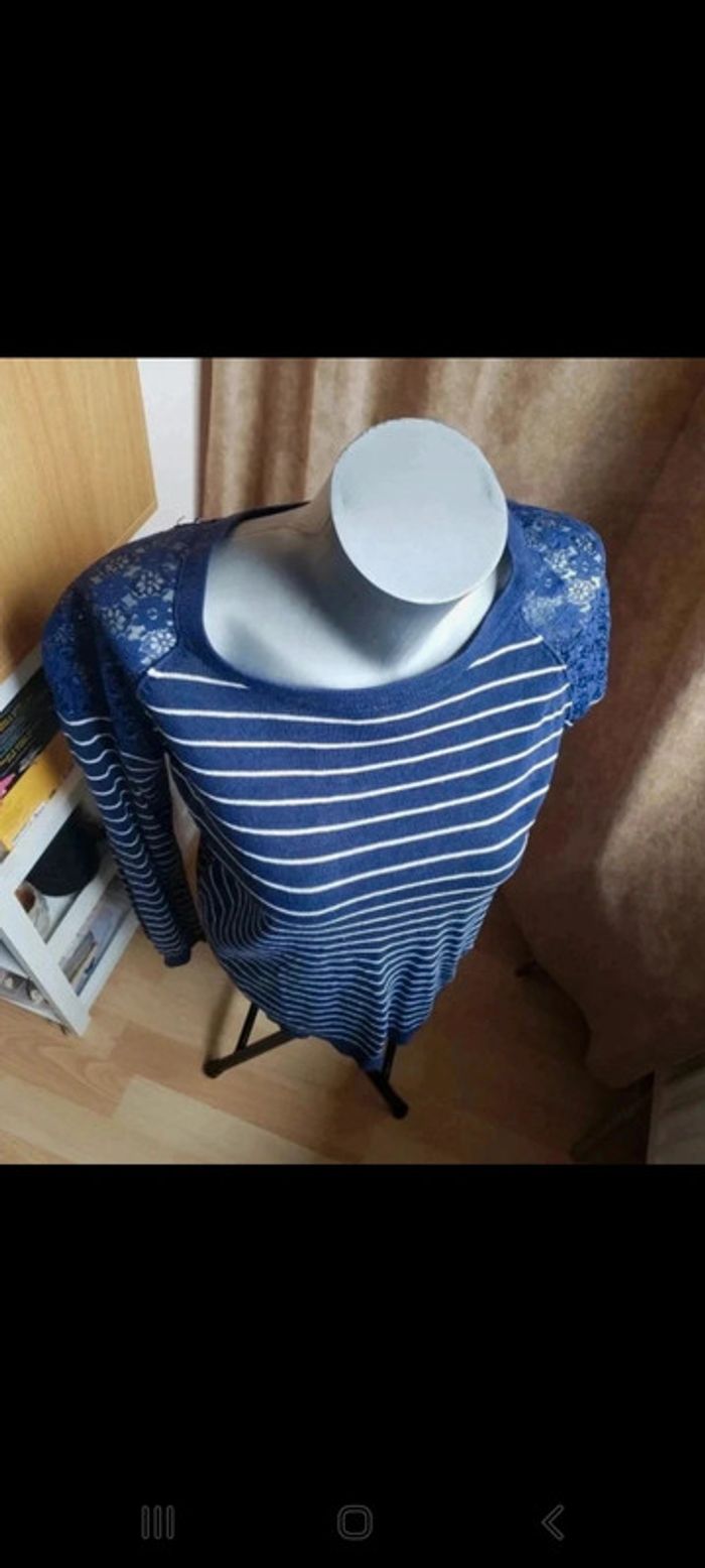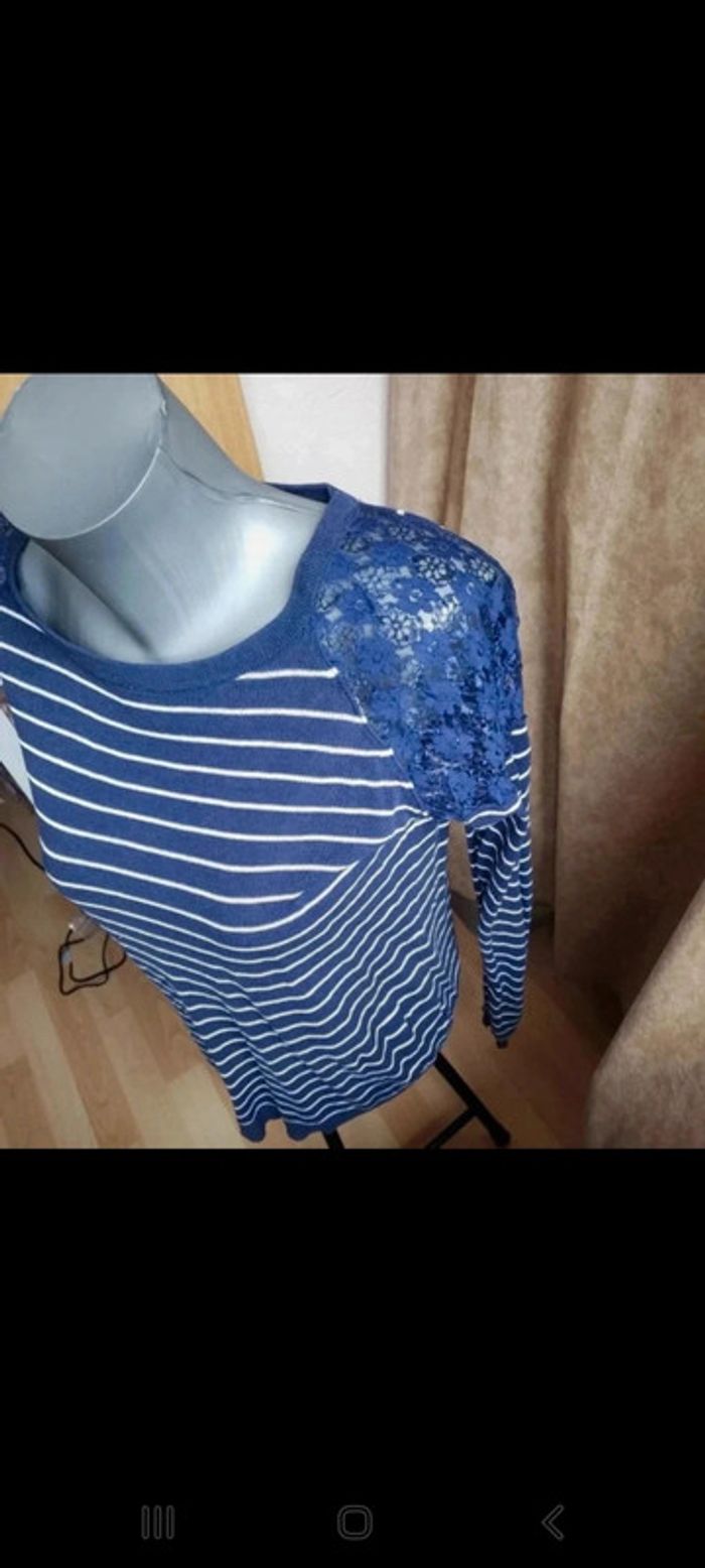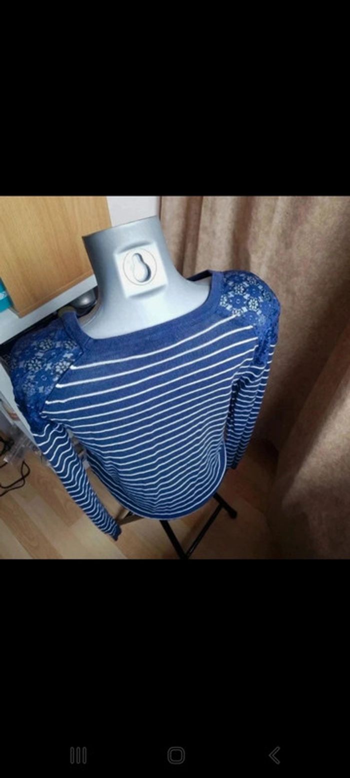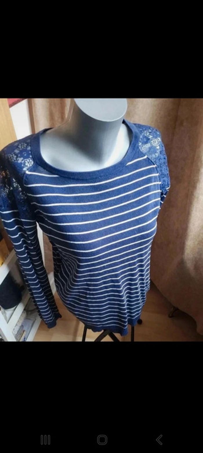 Pull fin ajouré fausse dentelle sur les épaules et rayé blanc. En bon état. Joli rendu. Conviendra bien à un 40, et 38/40. Maison non-fumeur Envoi soigné #maddy71femme40