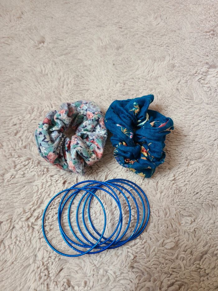 Lot de 2 gros chouchous + bracelets métal argenté et bleu vif. Le tout en vraiment bon état. Les chouchous ont été fait par une artisane. Maison non-fumeur Envoi soigné #maddy71bijoux