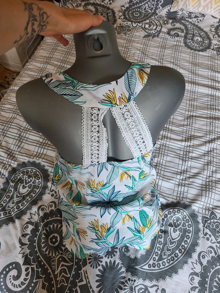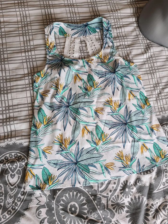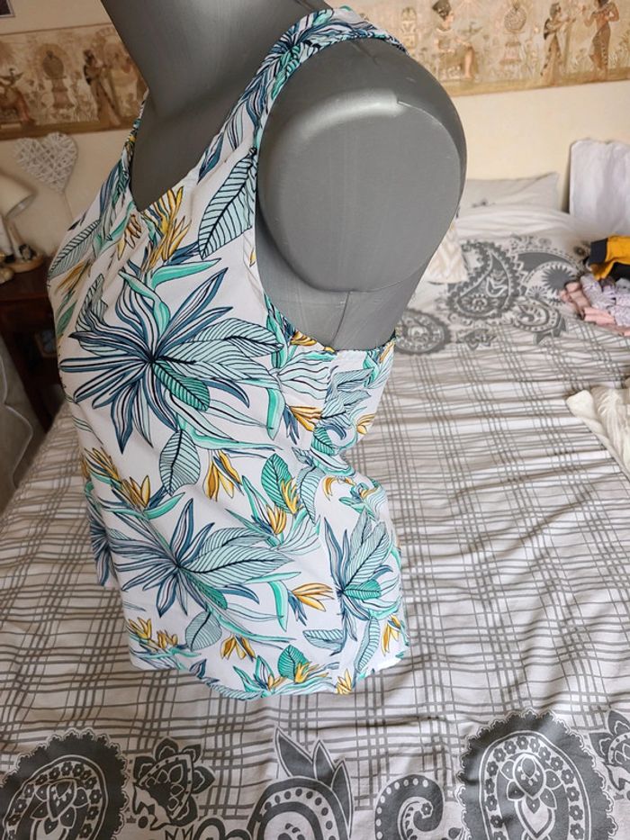 Beau top d'été. Motif tropical. Léger et fluide. En super état. 62 cm de long et 44 cm d'aisselle à aisselle. Maison non-fumeur Envoi soigné #maddy71femme38ete #maddy71femme38