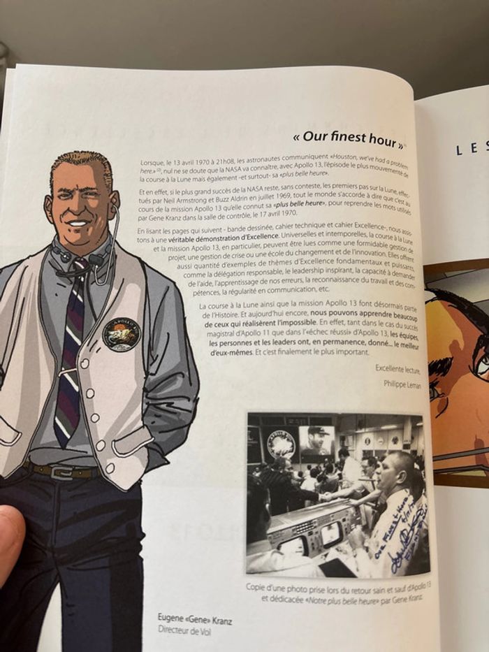 13 avril 1970, 21h07. 334.325 kilomètres de la Terre. Apollo 13 est la troisième mission habitée visant à mettre le pied sur la Lune. Après 56 heures de vol, c'est l'explosion... terriblement dévastatrice. Perte d'oxygène, d'eau, de chaleur, d'énergie... Seul objectif désormais: ramener l'équipage vivant. cela sera possible grâce aux efforts et aux attitudes exemplaires des équipes au sol. Avec Apollo 13, nous assistons à une véritable démonstration d'Excellence. Si Apollo 11 (le premier pas sur la Lune) reste le plus grand succès de la NASA, Apollo 13 est sa plus belle heure. Car c'est face à l'adversité que les personnes, les équipes et les leaders ont vraiment donné le meilleur d'eux-mêmes. Une quinzaine de thèmes d'Excellence (allant de l’apprentissage des erreurs à la créativité, de la délégation responsable à la régularité dans la communication, etc.) sont donc développés dans le Cahier Excellence faisant suite à une bande dessinée hyperréaliste de 36 pages.