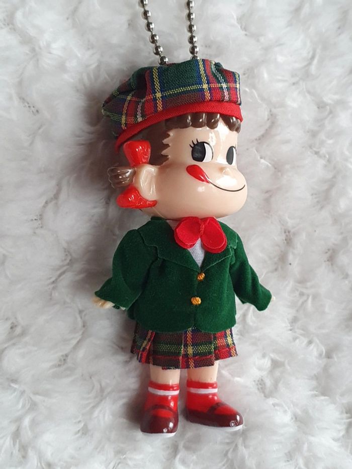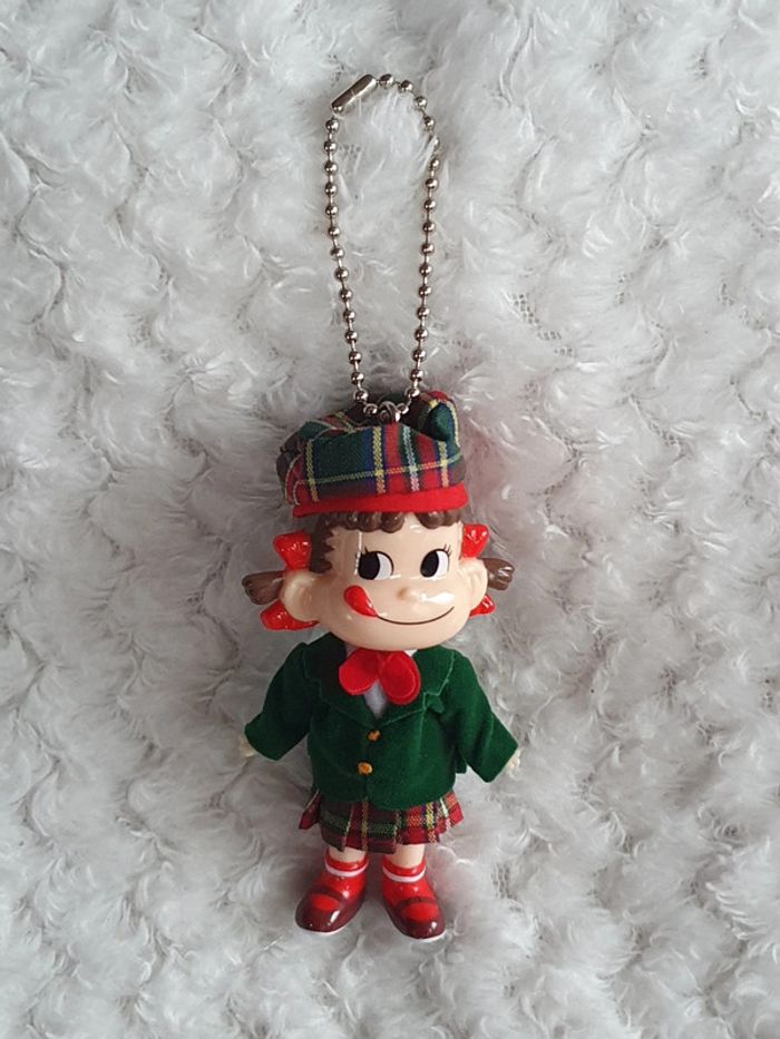 Peko-chan Keychain British Style Japan Fujiya Character Vintage Difficult to Obtain Kawaii Magnifique porte clé strap keychain provenant du Japon 🌸✨️ figurine à l'effigie de la mascotte des bonbons Milky PEKO-chan vêtements vert et rouge angleterre 🌞 vintage japan toys retro japao giaponne portachiavi 8cm x 4cm