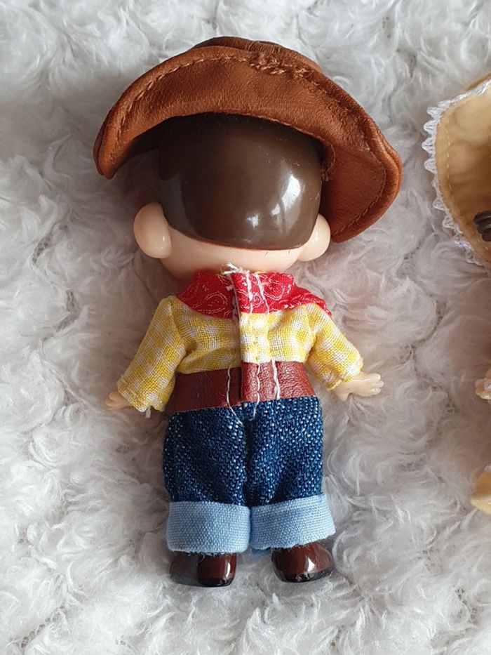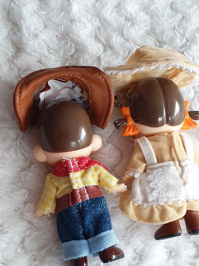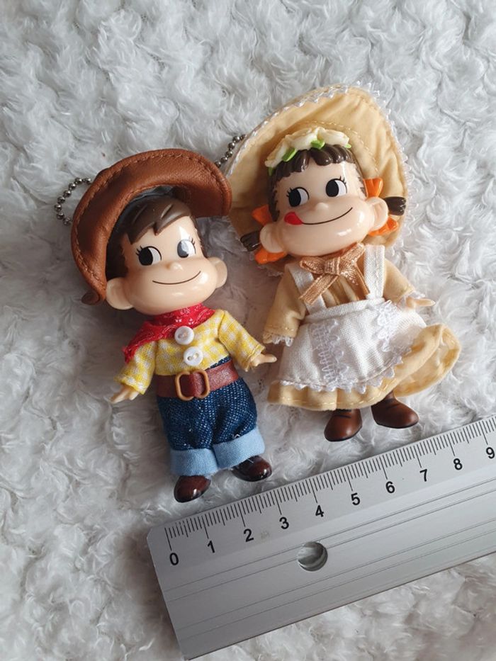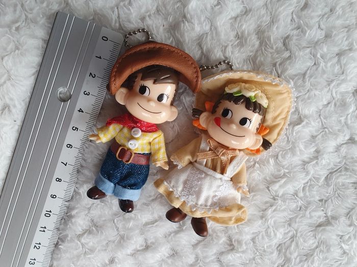 Lot de 2 magnifiques porte clé strap keychain provenant du Japon 🌸✨️ à l'effigie de la mascotte des bonbons Milky PEKO-chan et POKO-chan vêtements de fermiers 🌞 vintage japan toys retro japao giaponne portachiavi 8cm x 4cm