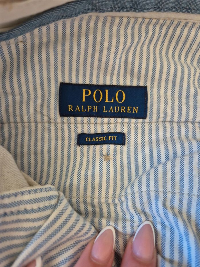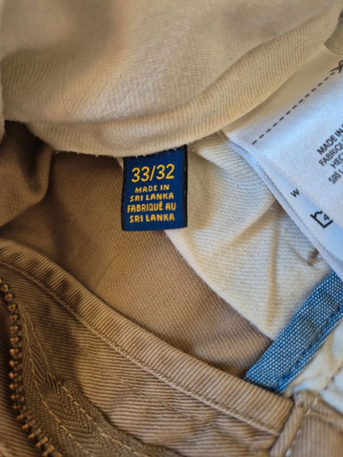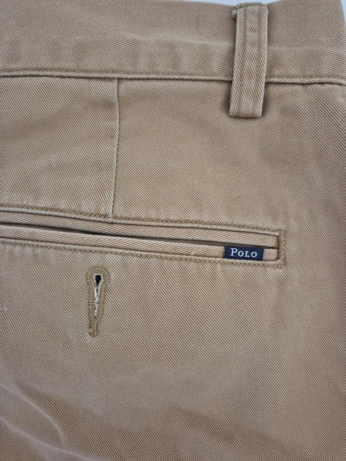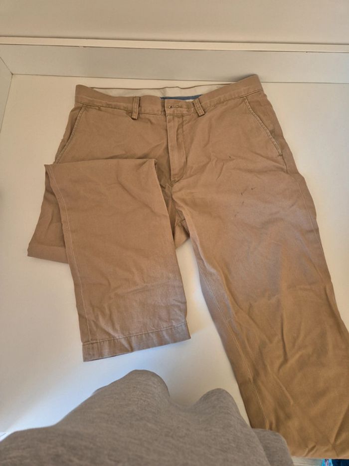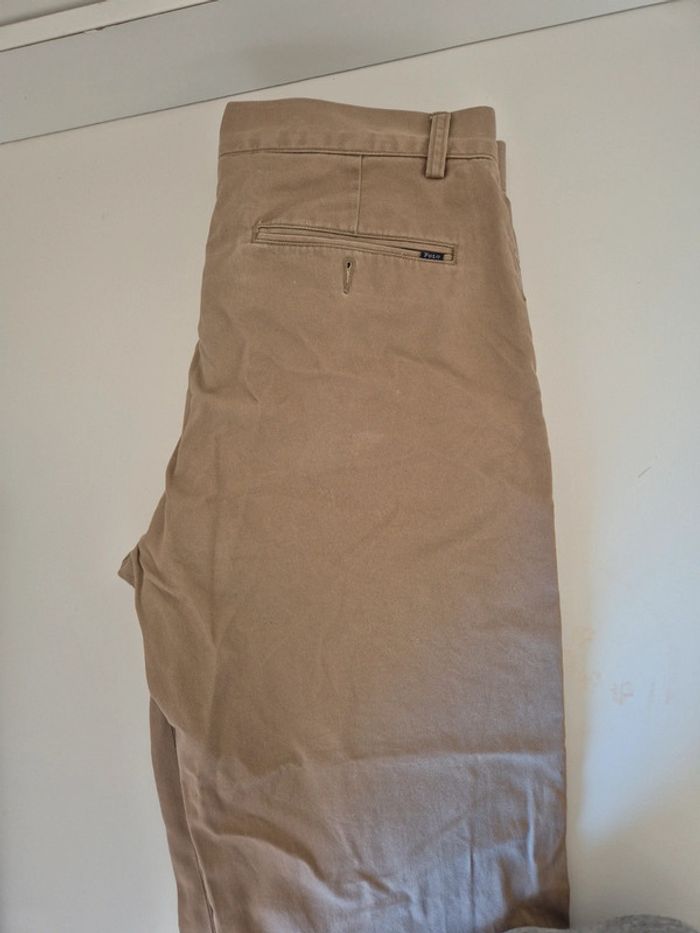 Jeans beige manque un bouton et marque de feutre sur la jambe gauche