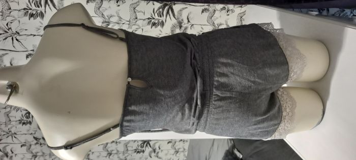 Combishort gris ETAM Dentelle blanche à l’encolure Et bas des jambes Taille resserrée par petite ceinture tissu 2 poches devant Polyester et viscose Taille M #T38_imoddeco