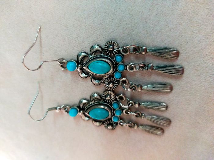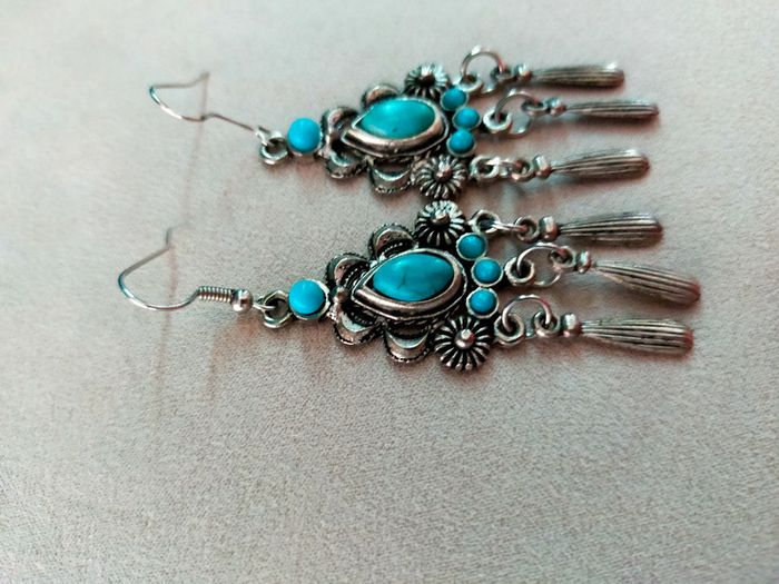 oucles d'oreilles pendantes style ethnique bohème argenté & turquoise - Collection Terres d'Ailleurs - photo numéro 1