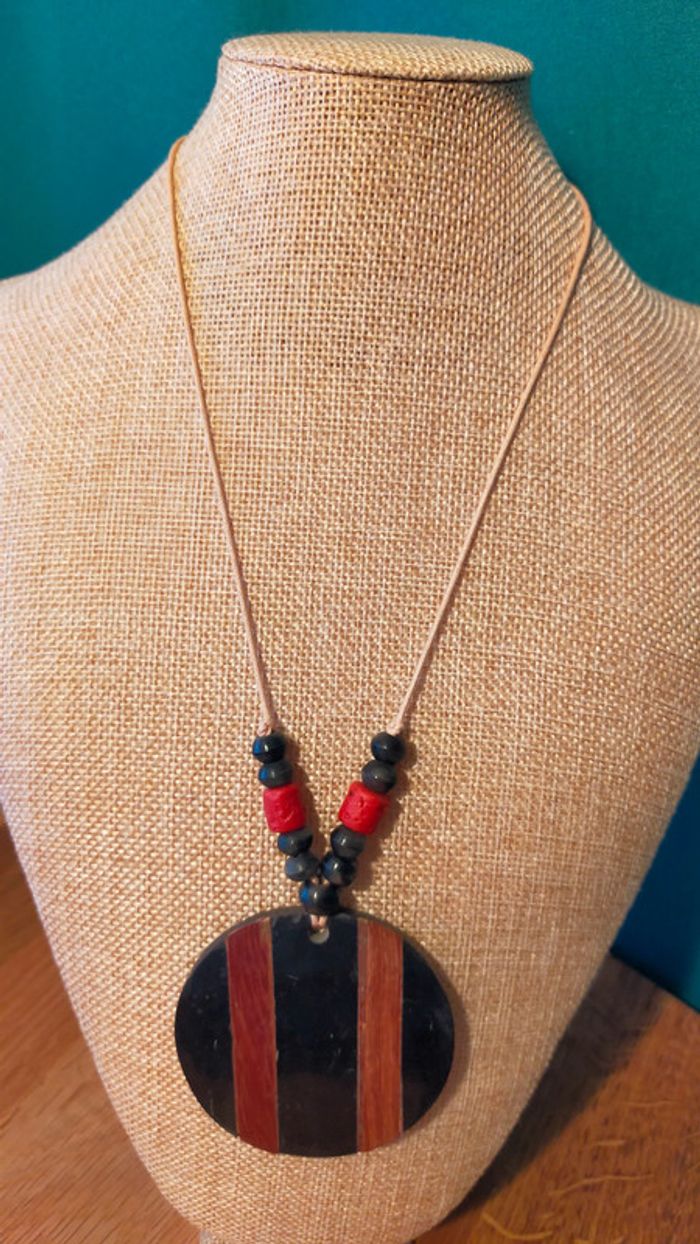 Collier original avec pendentif rond plat en résine noire incrustée de deux larges bandes de bois (probablement bois exotique type palissandre ou acajou). Le pendentif est monté sur un cordon beige, avec des perles noires (résine ou plastique imitation corne) et deux perles rouges sculptées façon corail (matière synthétique ou polymère). 🧵 Fermeture : sans fermoir – à enfiler 📏 Longueur totale : environ 45 cm 🎨 Couleurs : noir, bois rouge, rouge brique, beige naturel 🪵 Matières : Pendentif : résine + bois Perles noires : résine Perles rouges : polymère sculpté Cordon : coton ou lin ciré 🌍 Style : ethnique / tribal / naturel 📦 État : Très bon état 📁 Pièce unique (fait main ou artisanat étranger) L1R #collierethnique #bijouartisan #collierbois #pendentifrond #bijouresine #styletribal #faitmain #bijounature #colliernoirrouge #terresdailleurs