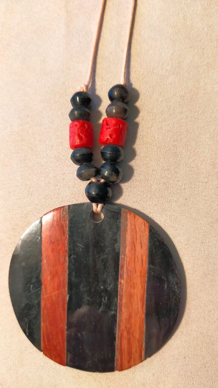 Collier pendentif rond noir & bois – Style ethnique - photo numéro 1