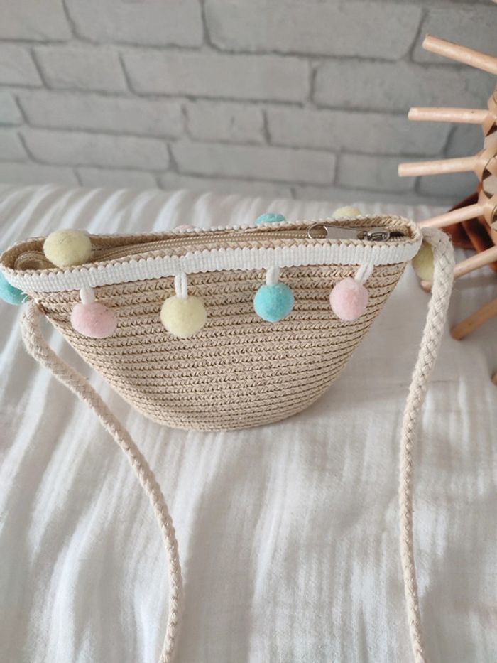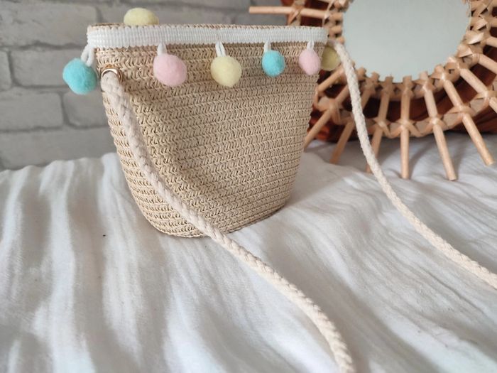 Petit sac en osier pour fille – Pompons pastel & bandoulière longue - photo numéro 1