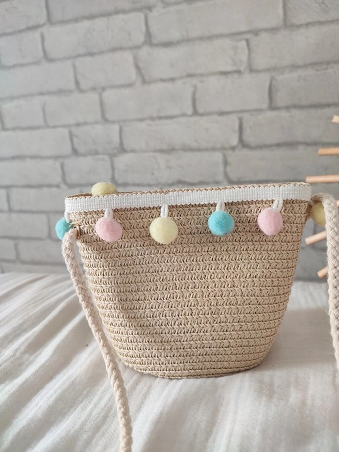 Petit sac en osier pour fille – Pompons pastel & bandoulière longue
