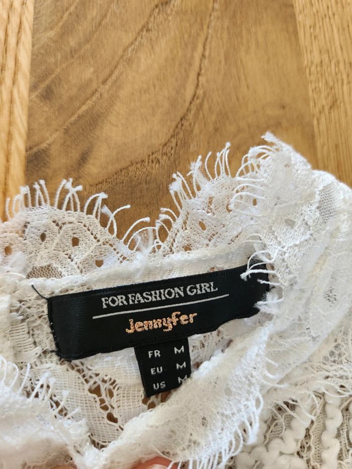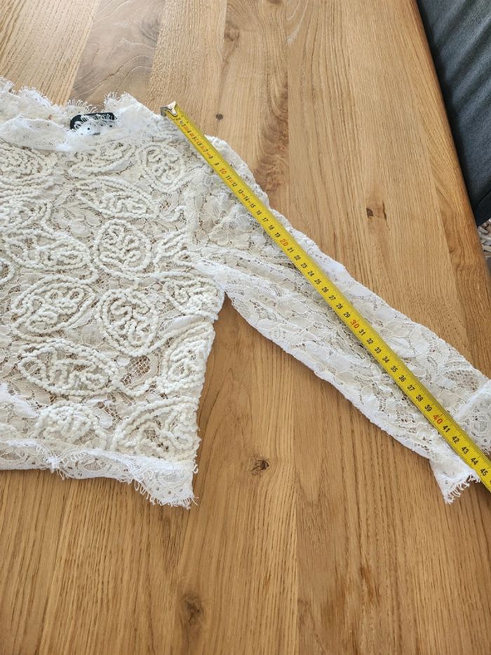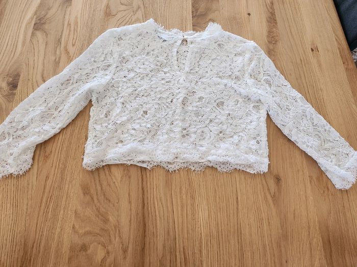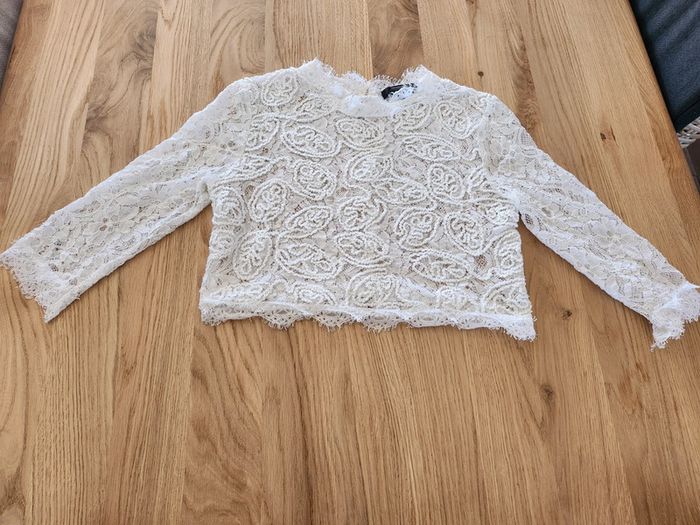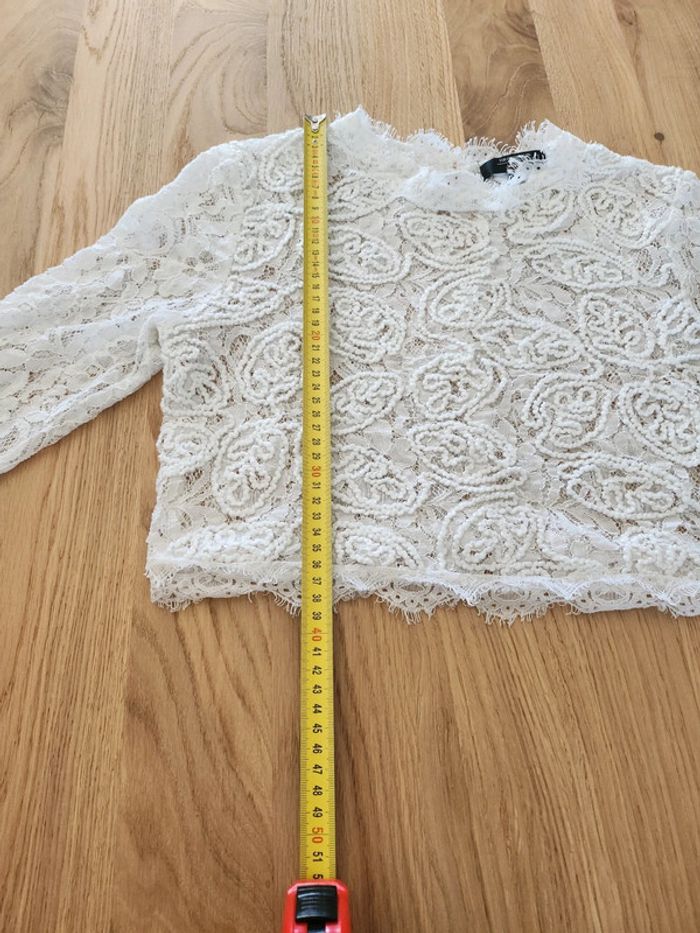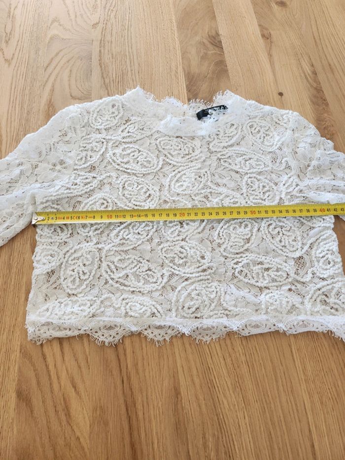 ➡️ top crop top Tee-shirt manches 3/4 blanc a dentelle,bouton dans le dos