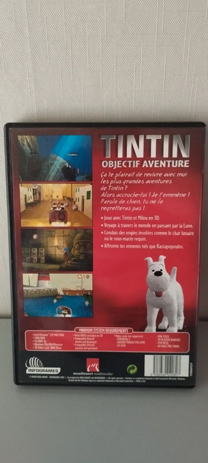 CD Rom jeu pour PC. Tintin objectif aventure Joue avec Tintin et Milou en 3D Voyage à travers le monde en passant par la lune. Conduis des engins insolites comme le char lunaire ou le sous-marin requin. Affronte tes ennemis tels que Rastapopoulos. Très bon état. #linejacjeuxpc