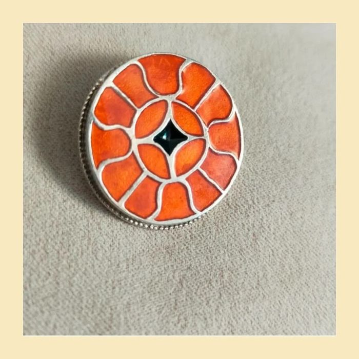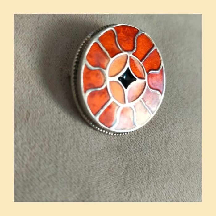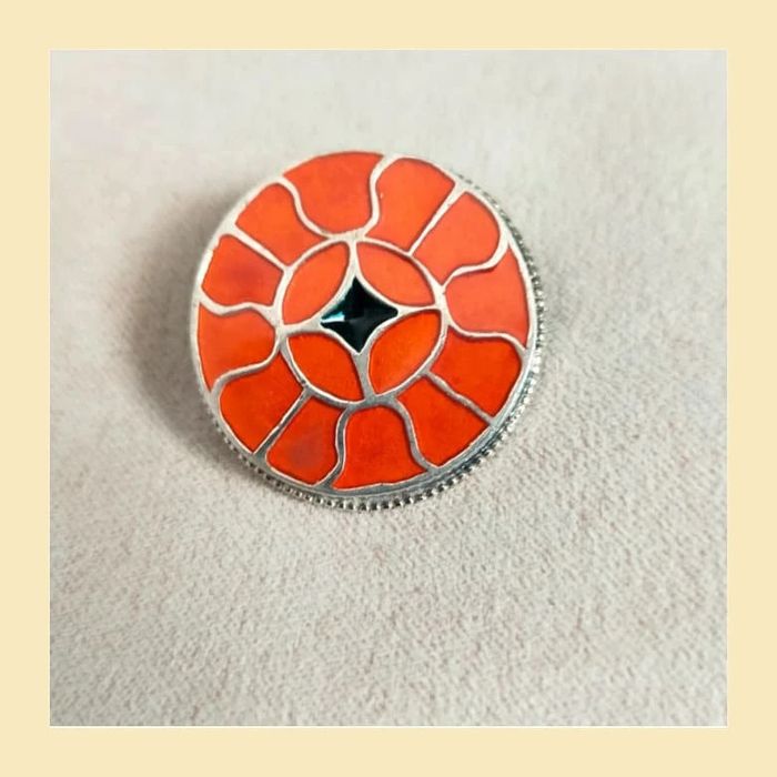 Magnifique broche vintage en métal argenté, au motif floral géométrique inspiré du style cloisonné. Les pétales émaillés dans des nuances orangées contrastent avec un cœur noir en losange pour un effet lumineux et original. Monture ronde avec contour perlé, fermoir à épingle classique à l’arrière. Une pièce à la fois colorée et raffinée, parfaite pour accessoiriser un manteau, une veste ou un sac. 🔸 Couleurs : orange, noir, argenté 🔸 Fermoir : épingle 🔸 Style : vintage, floral, oriental 🔸 Diamètre : env. 3,5 cm 🔸 État : très bon état général 📦 Envoi rapide & soigné. 🎁 Possibilité d’envoi en lot ou petit cadeau surprise pour les commandes multiples ! LBVIN2 #broche #brochevintage #cloisonné #bijouancien #orange #retrostyle #vintagelovers #accessoires #bijouxfantaisie