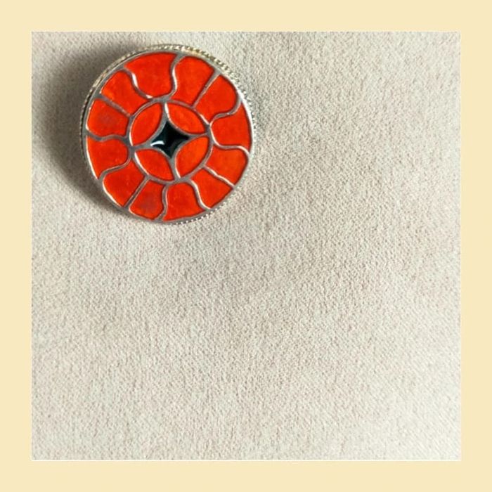 Broche vintage ronde émaillée – Motif floral orange et noir – Style cloisonné - photo numéro 5