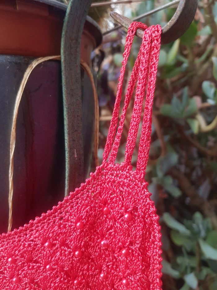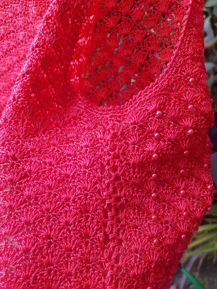 Débardeur crochet avec applications "perles" sur le devant. En parfait état. Charmant 🌹. Le tissu est assez souple, épouse le corps. Fait main, pas d'etiquettes mais conviendra à une taille S et M .