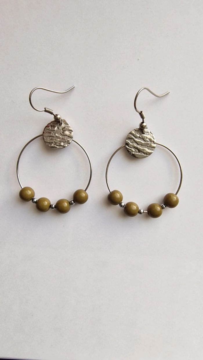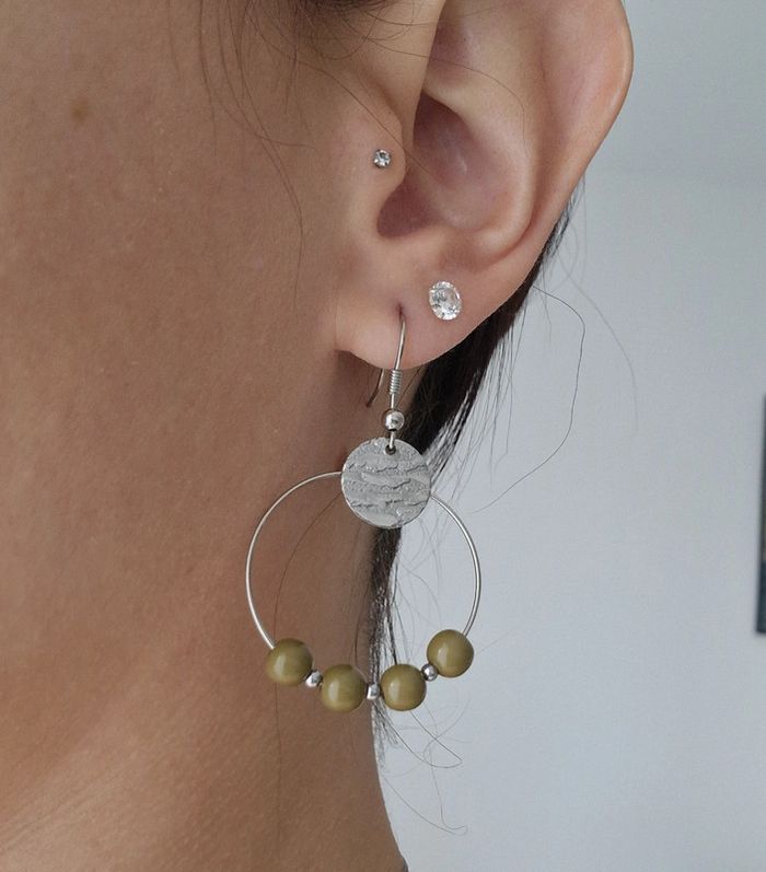 Boucle d'oreille créole en acier inoxydable argenté et perles kaki Marque Crystalia Perles comme neuf Diamètre 3cm #perles&co #créole #creolekaki #fetedesmeres #acierinoxydable