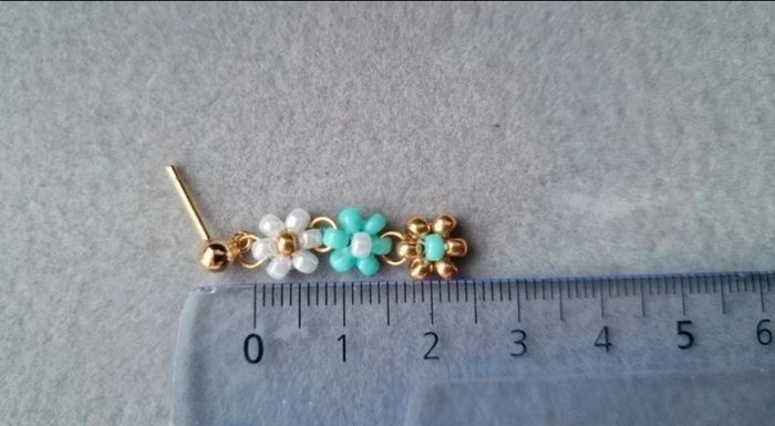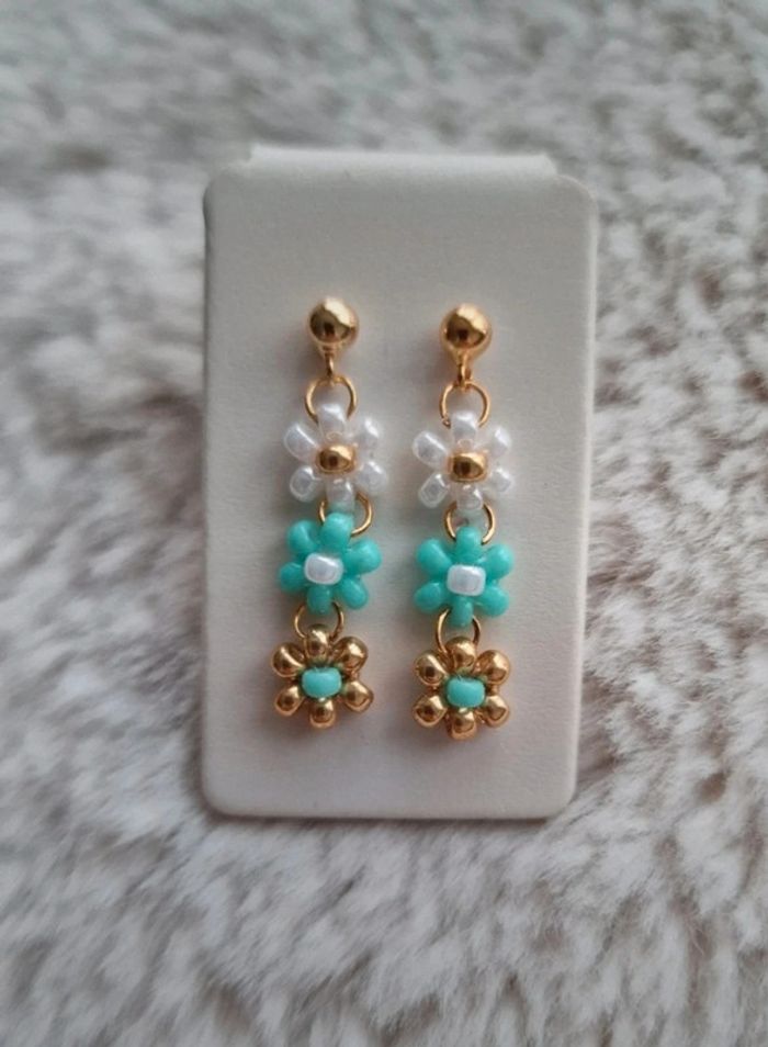 Boucles d'oreilles 3 fleurs Blanc nacré, vert d'eau et doré Marque Crystalia Perles comme neuf Taille 2,5cm #boucledoreilles #fleurs #bouclesdoreillesfleurs #perles&co #doré #été #fetedesmeres