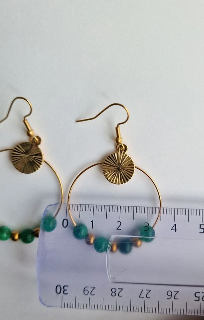 Boucle d'oreille créole en acier inoxydable doré et perles vertes Marque Crystalia Perles comme neuf Diamètre 3,5cm #perles&co #créole #creoleverte #fetedesmeres #acierinoxydabledoré