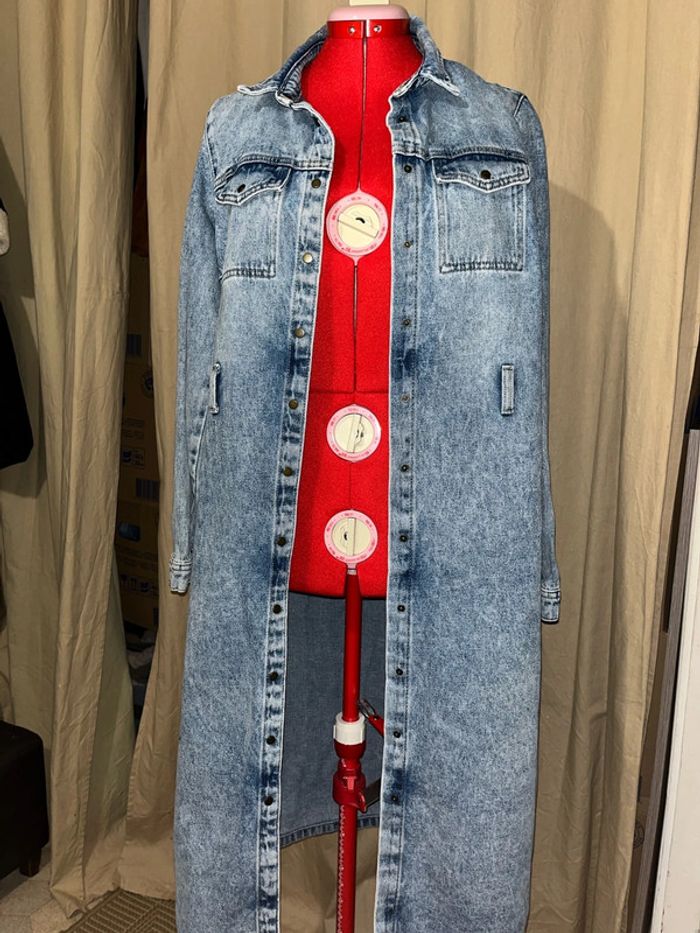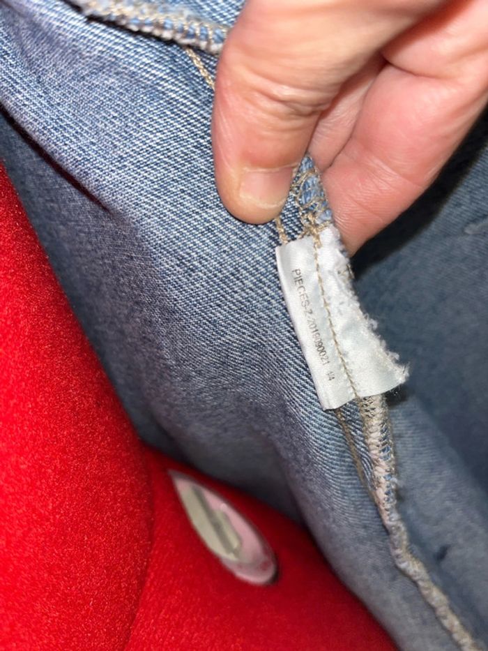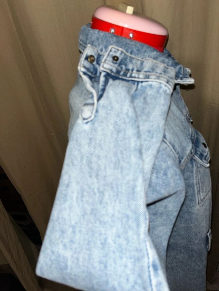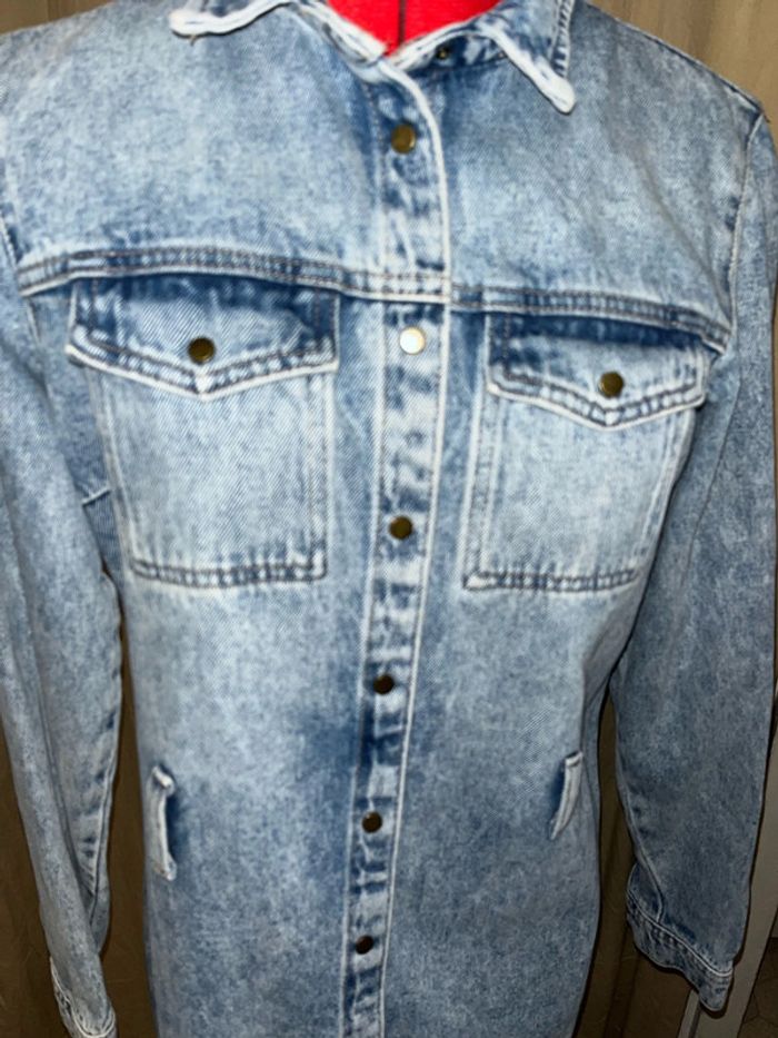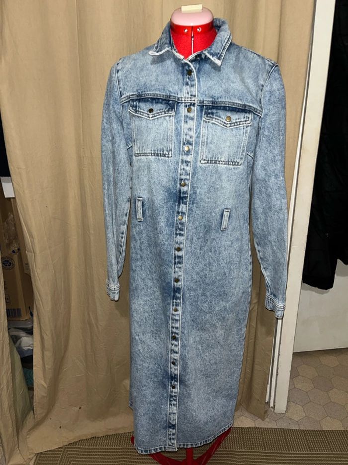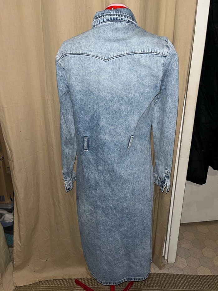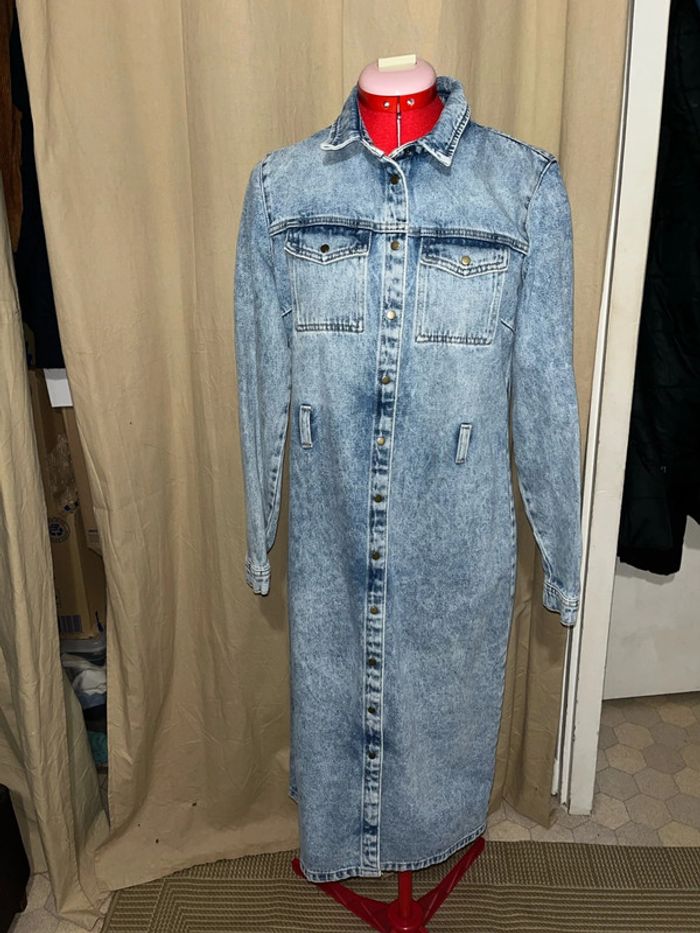 Magnifique robe à jeans pièces taille M arrive mi mollet avec deux poches elle peux se porter en robe ou veste juste canonnnn neuve manque juste l’étiquette mais le code dessus