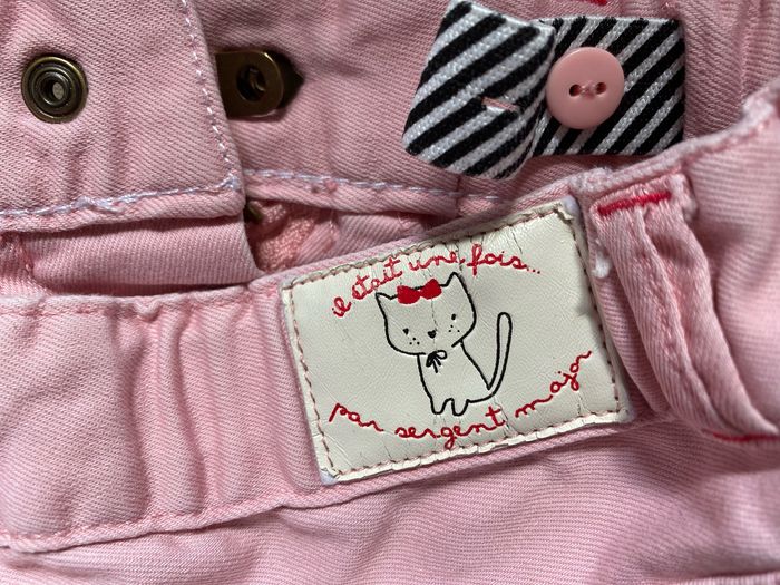 Magnifique pantalon jeans rose clair Bouton écussons chat, rivets forme coeur Réglable à la ceinture Taille 10 ans 140 cm 75% coton 23% polyester 2% elasthane Sergent Major