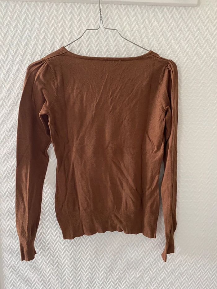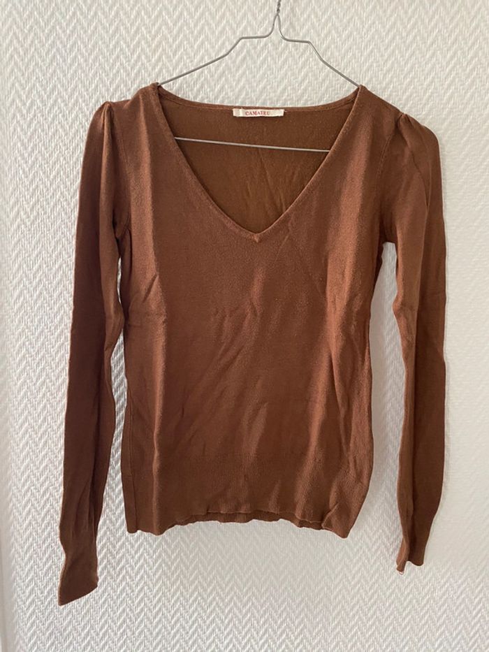 Pull léger marron, col V, camaïeu, taille XS, en très bon état.