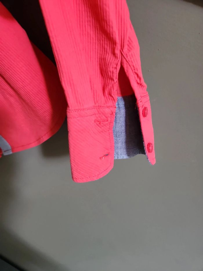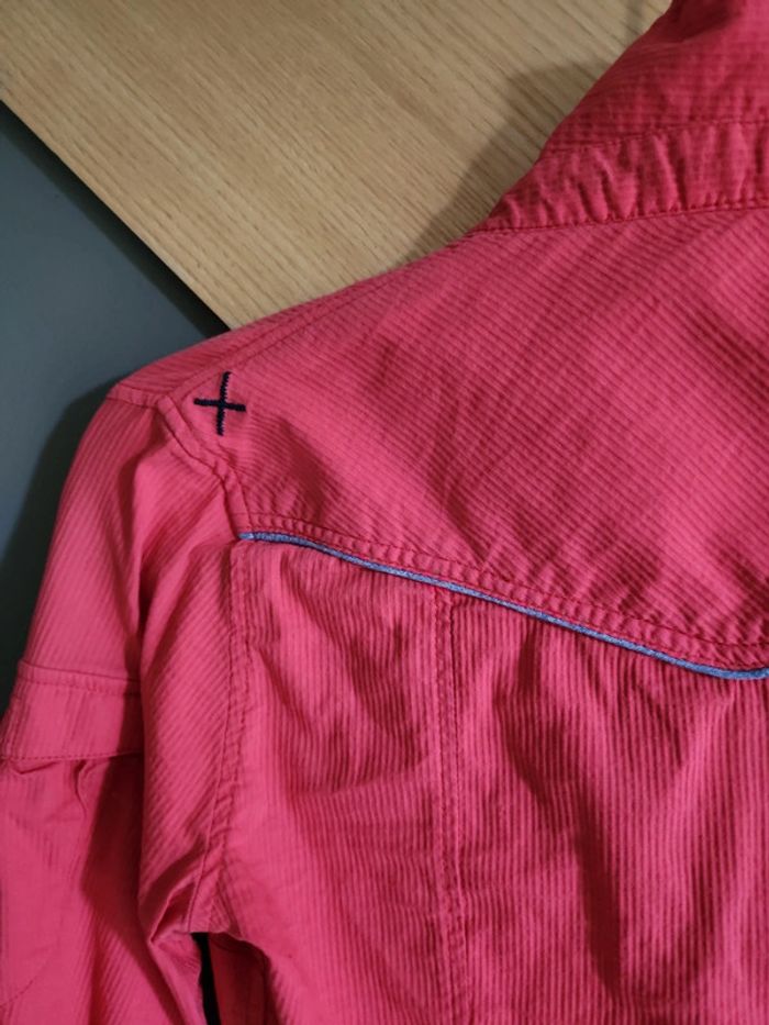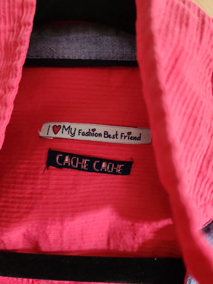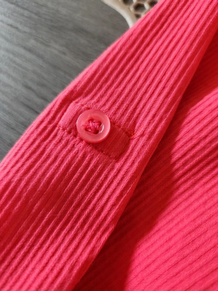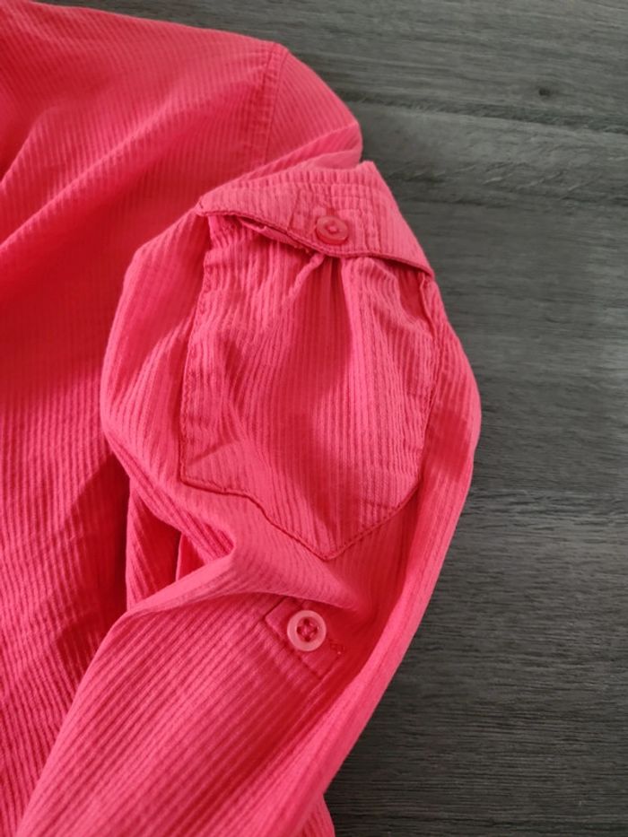 Un bouton de rechange sur étiquette intérieure Manches longues repliables et accrochées par boutonnière Petite poche sur le bras gauche Rose foncé