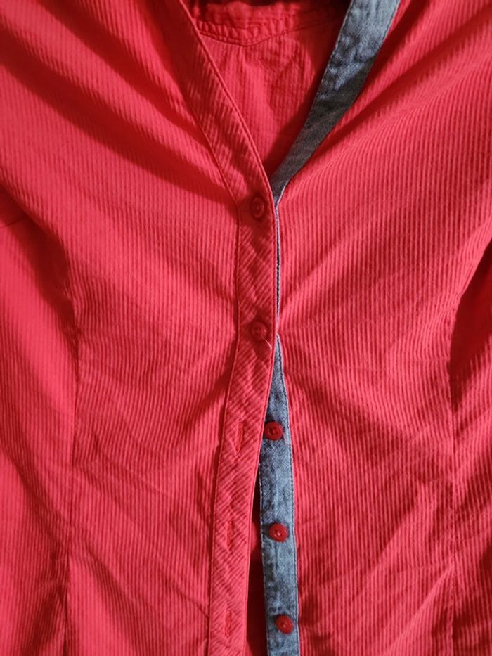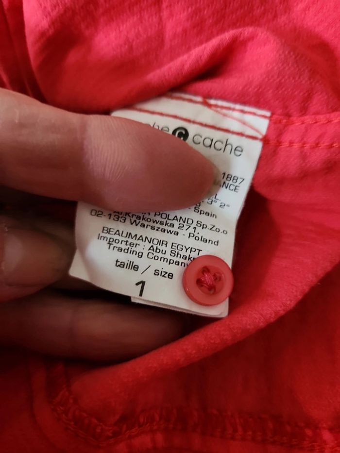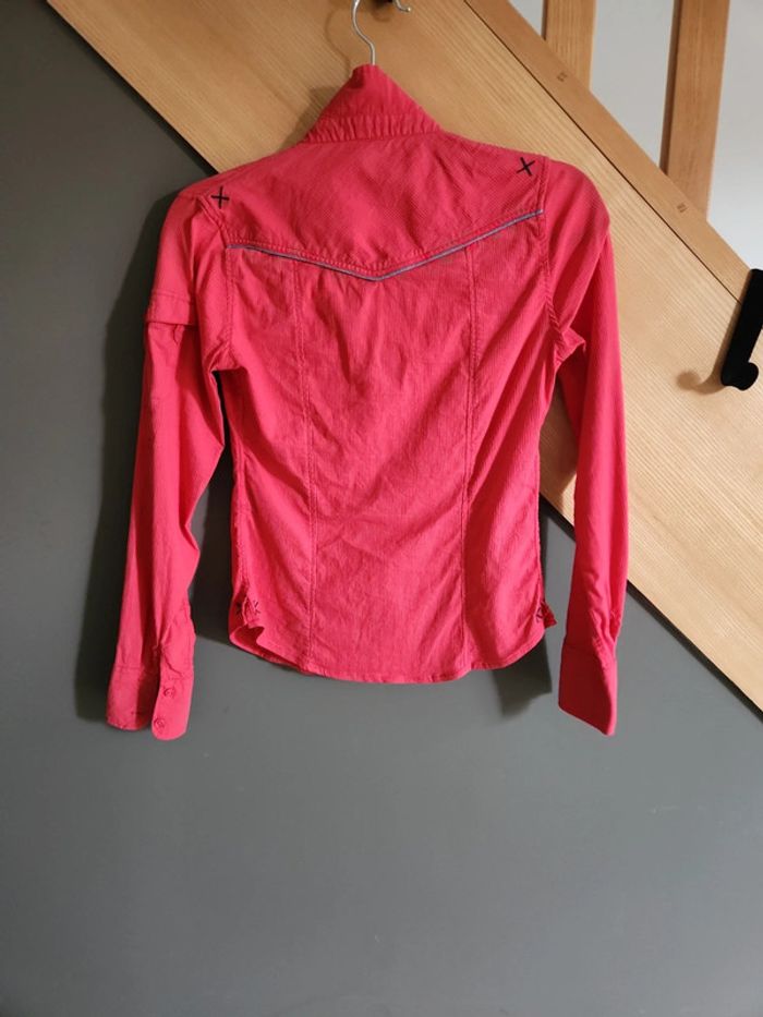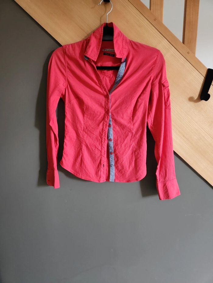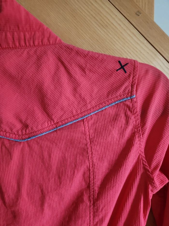 Un bouton de rechange sur étiquette intérieure Manches longues repliables et accrochées par boutonnière Petite poche sur le bras gauche Rose foncé