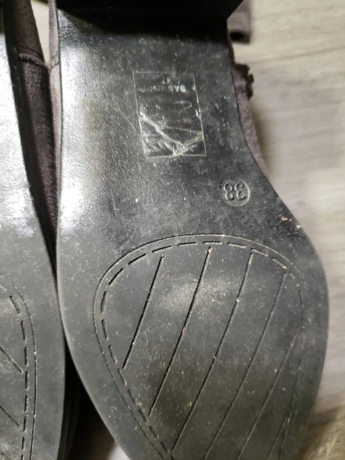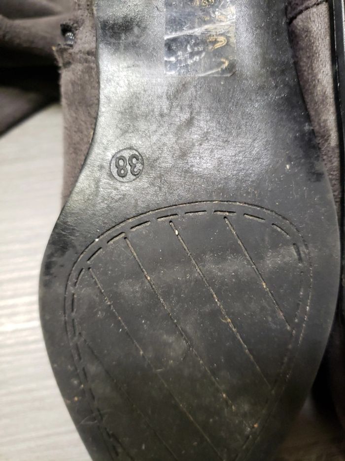 Portées quelques fois Attention, c'est du 38 et elles me vont alors que je fais du 37, il faut avoir le pied plutôt fin. Talon 3 cm Hauteur du haut du talon jusqu'en haut 52 cm Taille de la semelle extérieure 26 cm De mémoire achetées chez Gémo