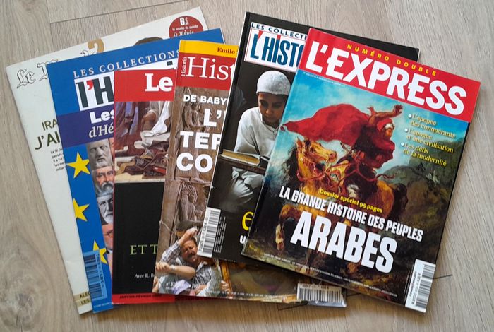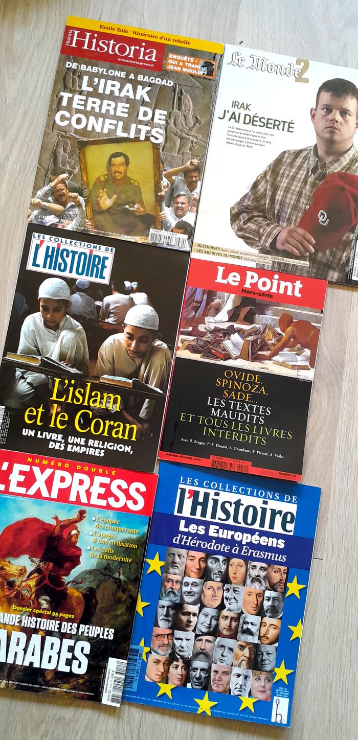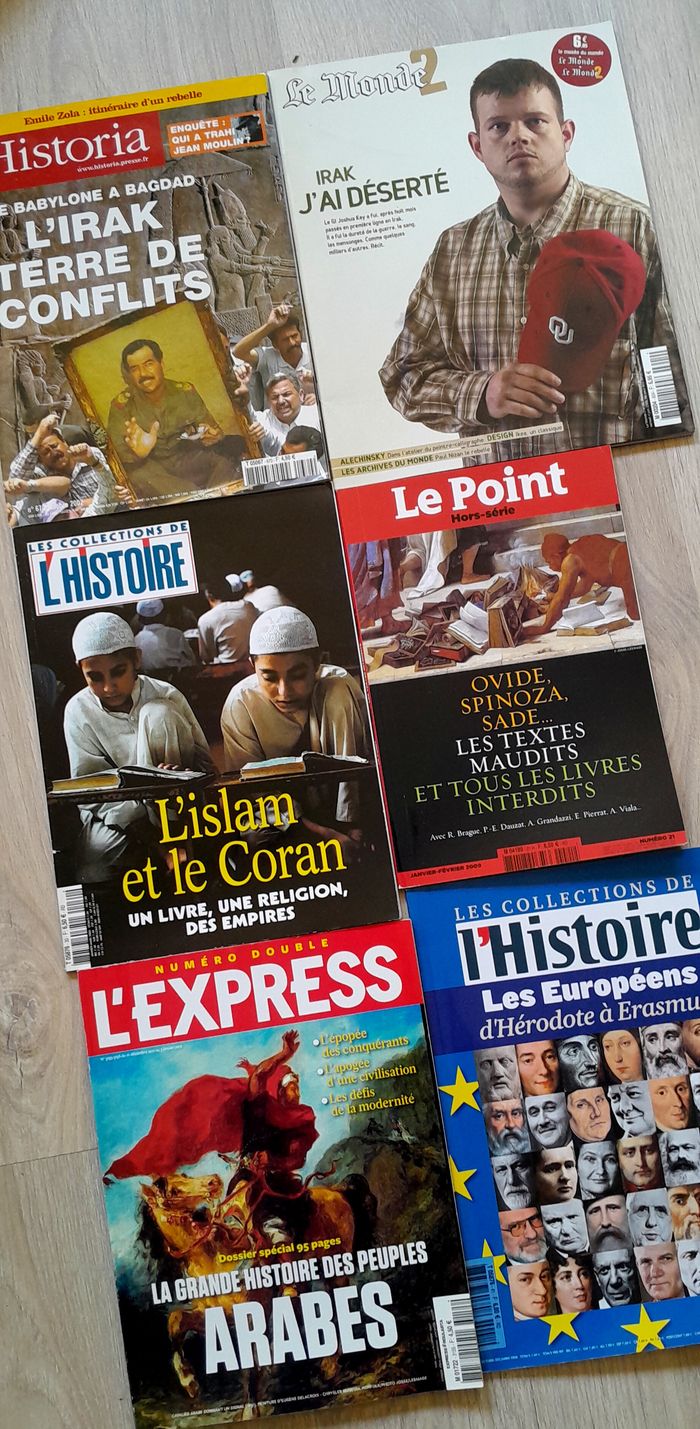 lot indissociable l'express la grande histoire des peuples arabes 170 pages 27x20cm les collection de l'histoire l'islam et le coran 97 pages 28x20cm historia l'irak terre de conflits de babylone à bagdad 98 pages 28x20cm le monde irak j'ai déserté 82 pages 29x23cm le point les textes maudits, les livres interdits 130 pages 25x17cm les collection de l'histoire les européens d'hérodote à érasmus 91 pages 28x20cm
