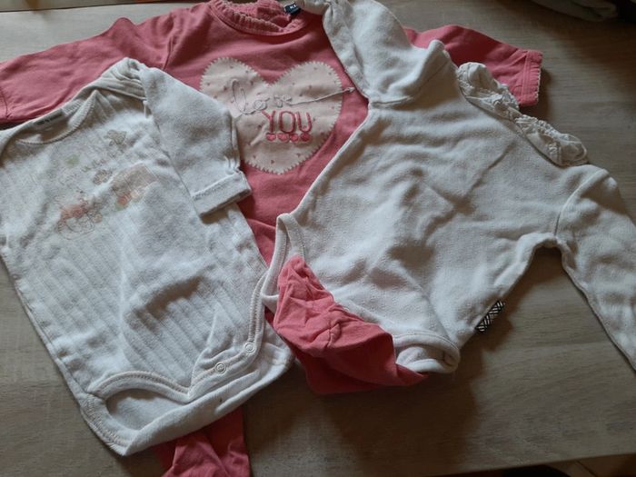 Lot 3mois en très bon état. 2 boddies manche longue et 1 pyjama fin. 2.00€
