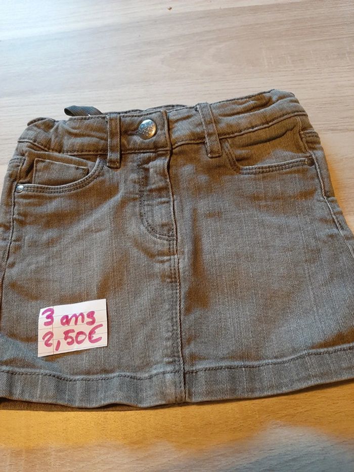 Jupe en jeans 3 ans( écrit 2-3 ans mais convient plus à un 3ans) en très bon état. Marque TeX. 2.50€ Couleur gris délavé
