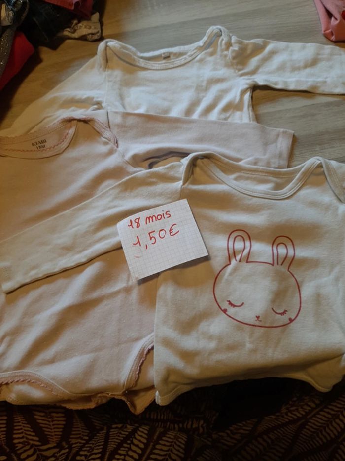 Lot de 3 bodies 18mois. En très bon état sauf celui qui a le dessin la couleur est un peu passer mais pas de tache ni de trou. Marque kiabi et les 2 autres je ne sais pas. 1.50e les 3