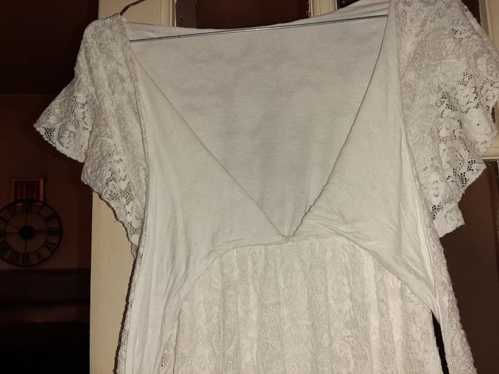 Vend robe blanche en dentelle avec "jupon" en dessous. Taille 36/38 je pense car quand je les acheter on m'avais dit taille unique. Noeud a fait sur le decolté. Jamais porté. A été lavé que une seule fois