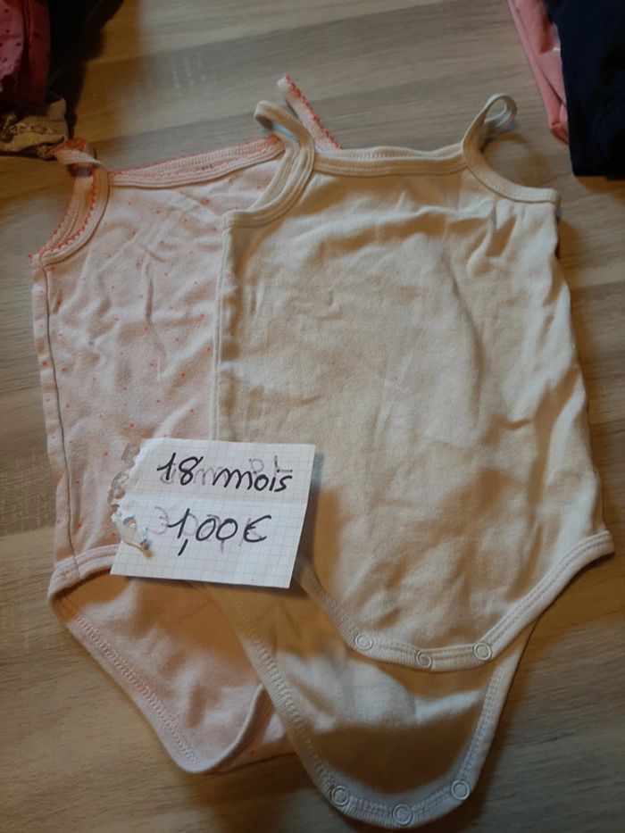 Lot de 2 bodies 18mois. En très bon état (le blanc est propre mais est rester longtemps au fond du placard donc il sera à relaver). Marque kiabi et kimbaloo. 1.00e