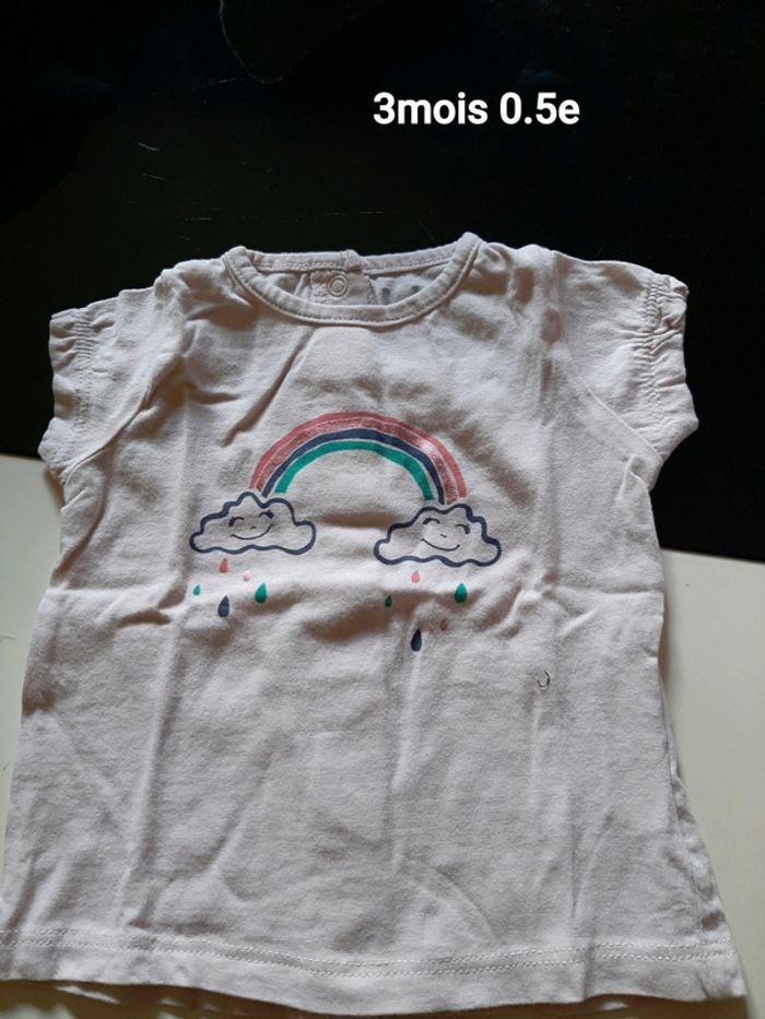 T-shirt 3mois 0.5e. Blanc passé. Pleins d'autres vêtements fille à vendre de 0 à 9mois.( l'article sera compter à 0.5e en vous envoyant une offre )