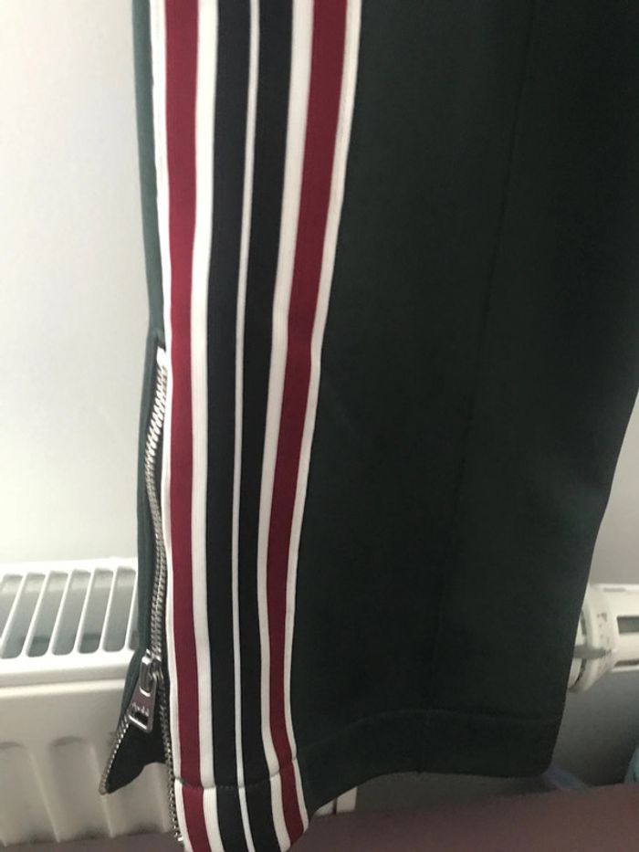 Jogging vert bouteille comme neuf mis seulement 1 fois bandes rouge / noir / blanc Zip argentés poches et bas