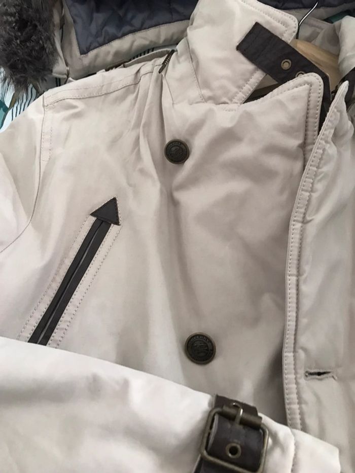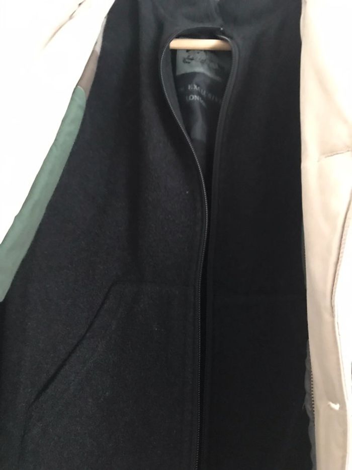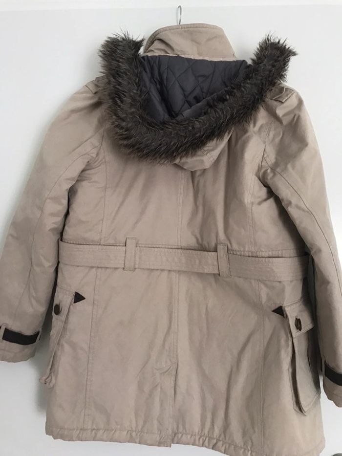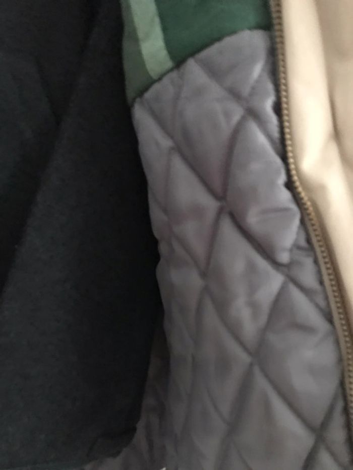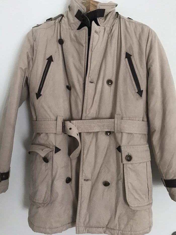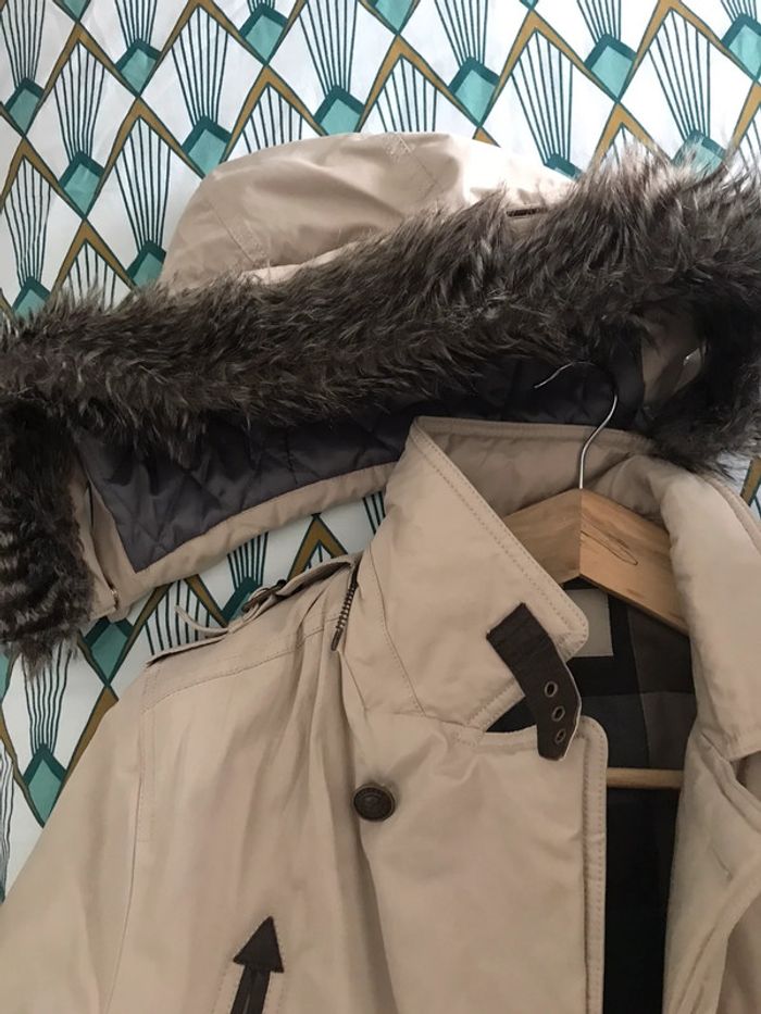 Se compose de 3 pièces, le manteau , la veste laine et la capuche Chacune des parties se détachent Capuche fourrure synthétique Empiècements cuir manches , poches et col Très très bon état je signale quelques traces une sous la poche gauche et petit pois bleu manche gauche . Vraiment une beauté on ne fait pas attention aux traces