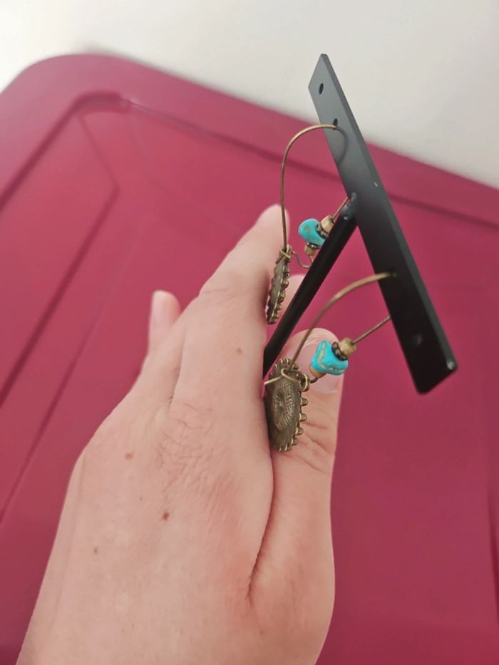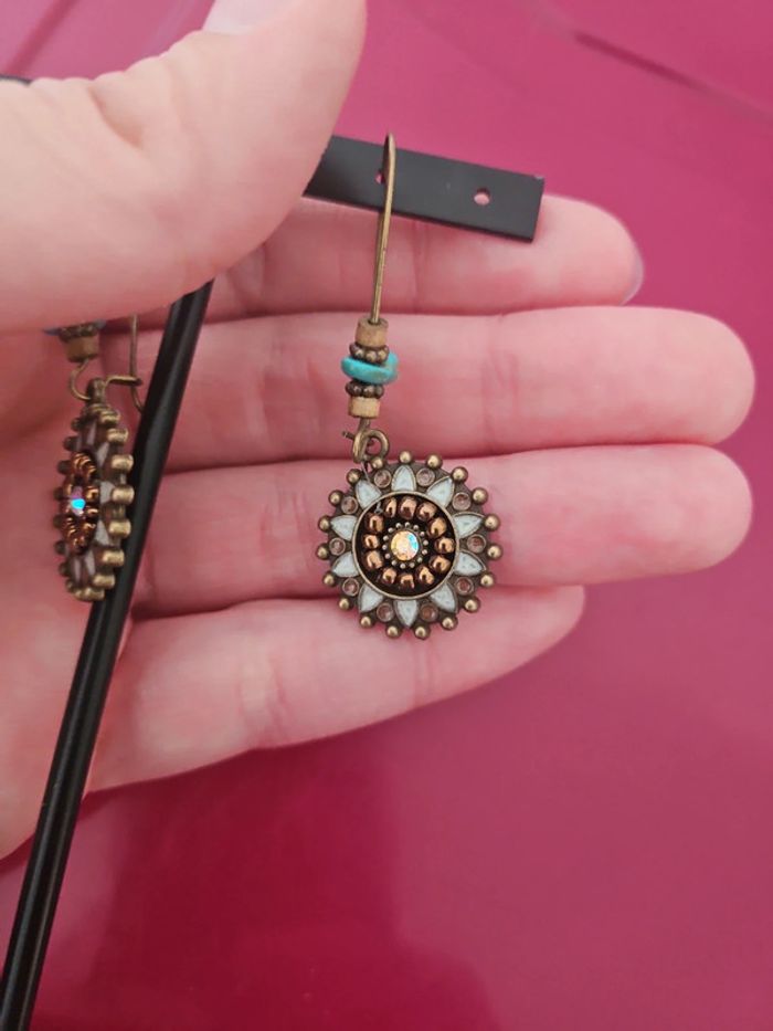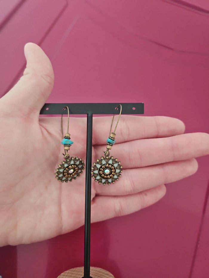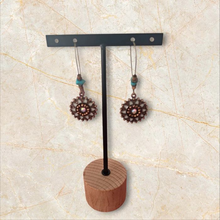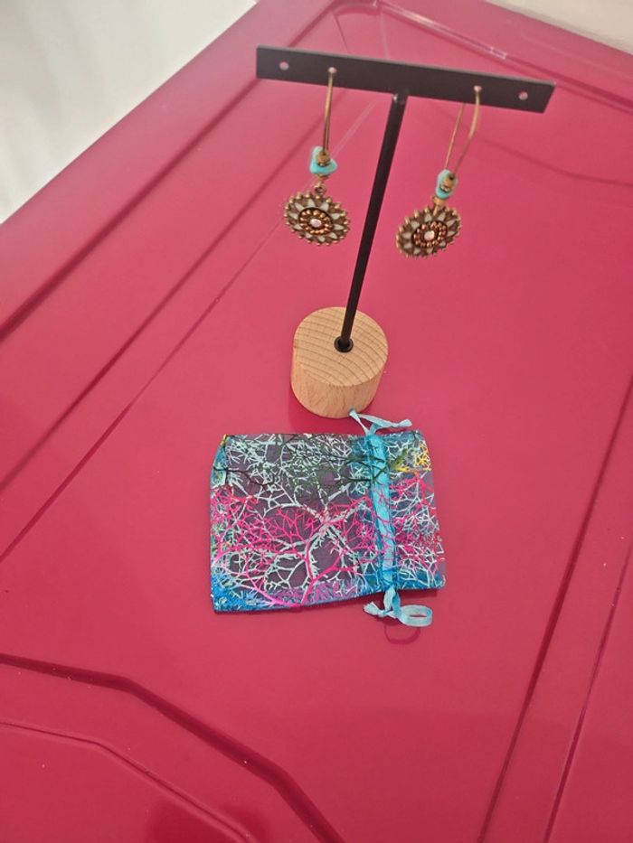 🎨 Colories: Bronze 🌻 Thème/motif: Rosace 💐 Détails supplémentaires: Fermoir crochet. Vendu avec un pochon en tissus. Le support n'est pas à vendre. Pas de photos portées.