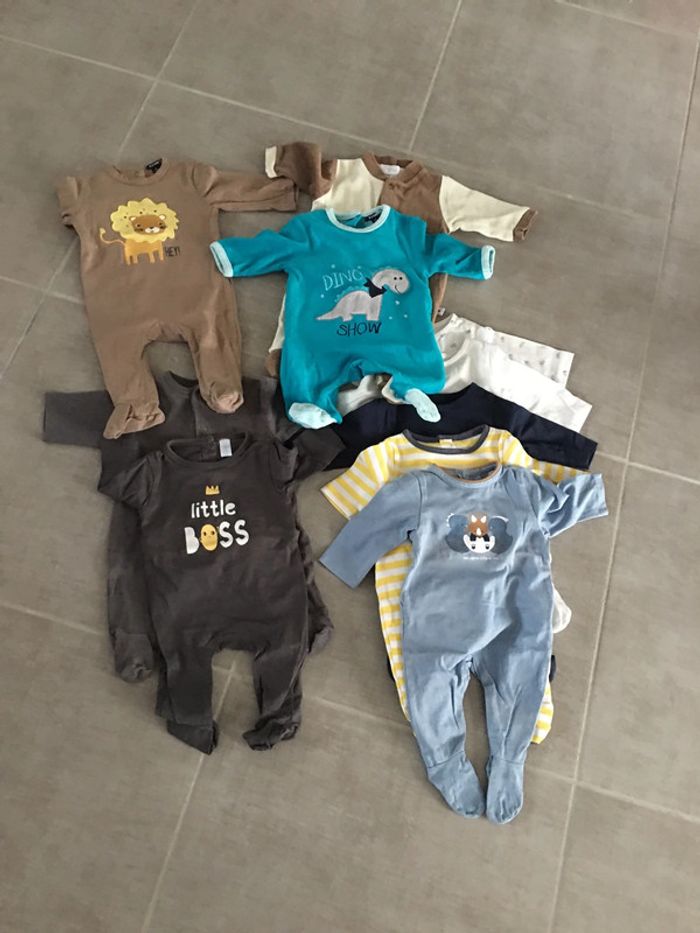 Lot de 10 pyjama Garçon de la naissance à 1mois 1/2 et 1 de 3 mois Très peu servi et très bonne état Marque 5 obaibi, 2 tex , 2 kiabi et 1 kinousse Sur le lot 2 chaud celui motif lions et de 3 mois