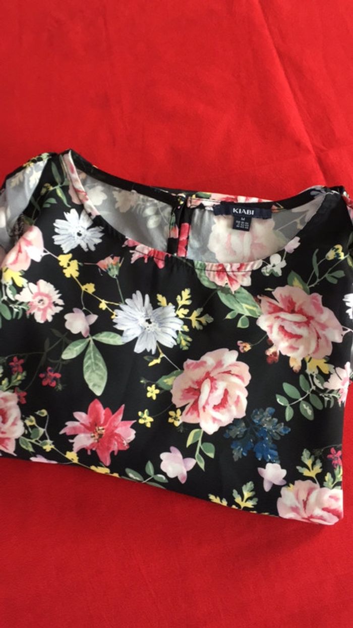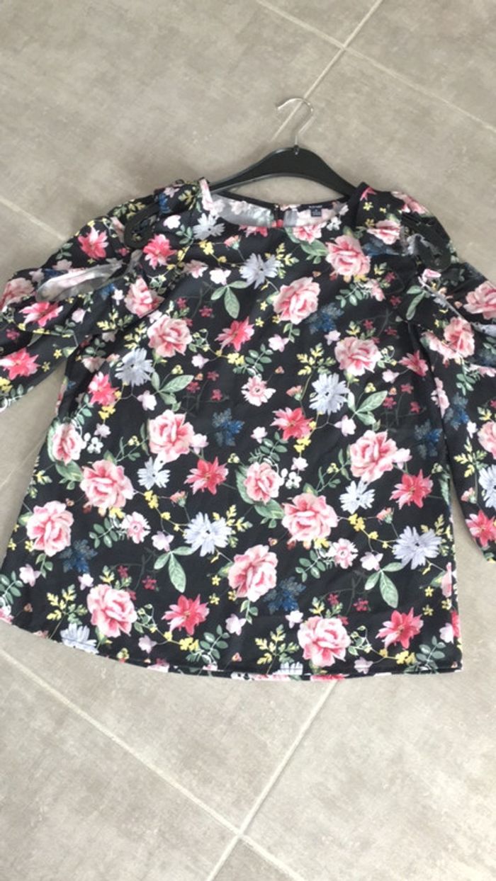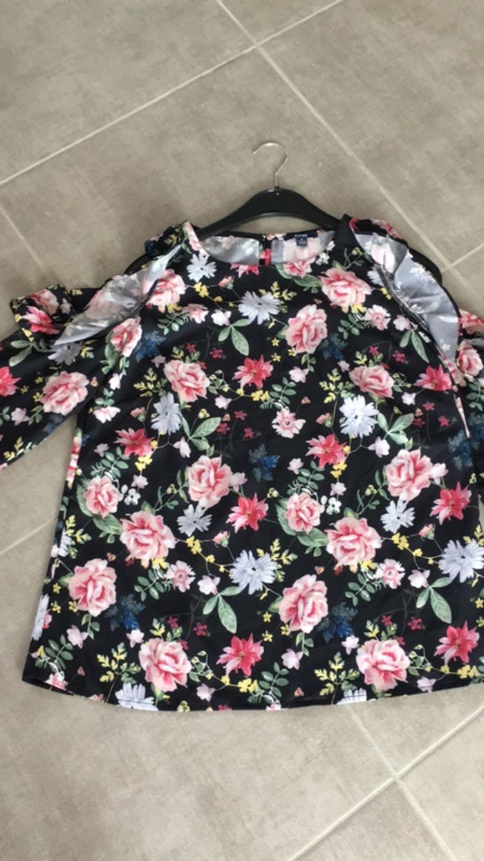 chemisier légère,épaule découverte ,manche 3/4 .tres bonne état . haut des manche volent , motif fleur sur fond noir