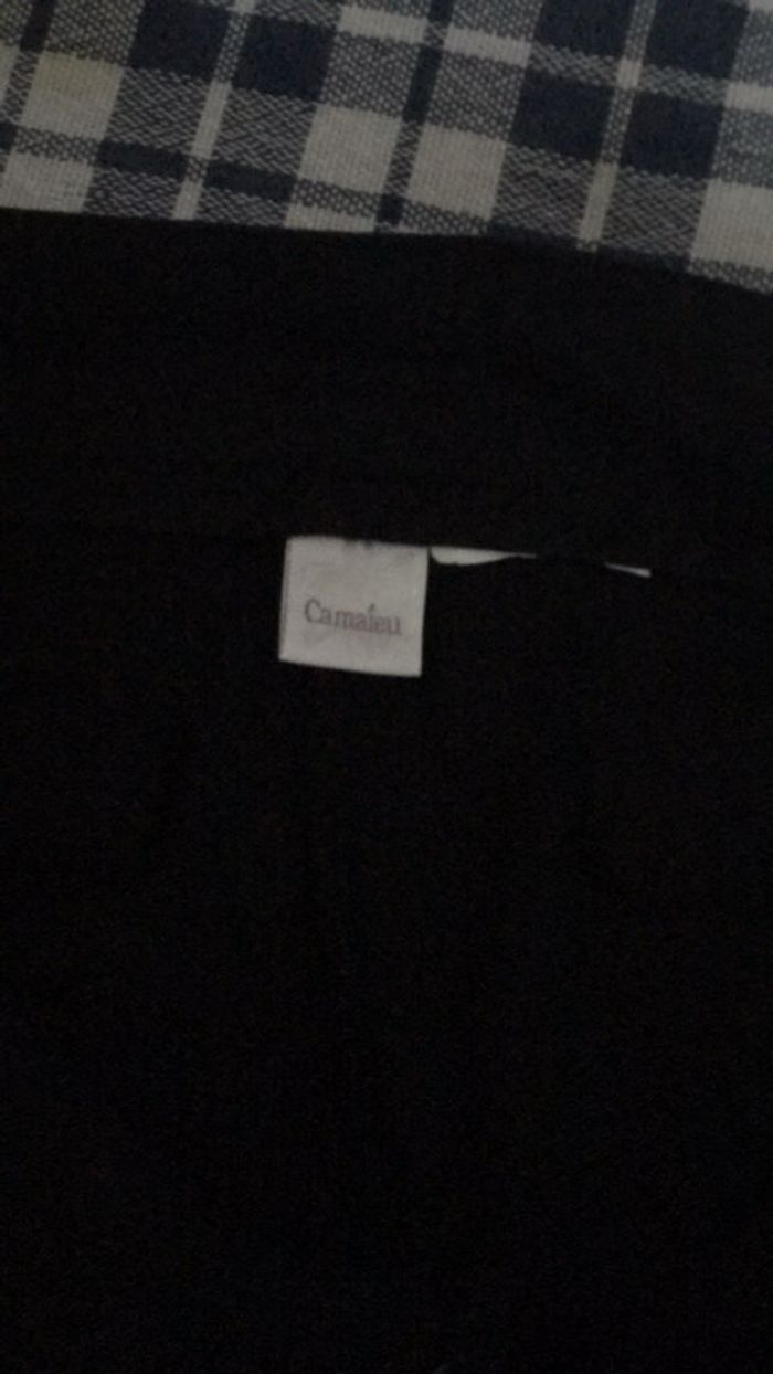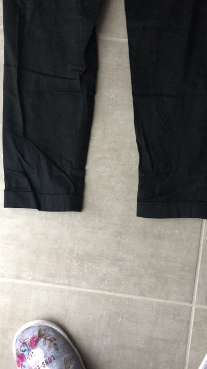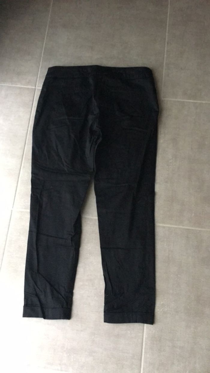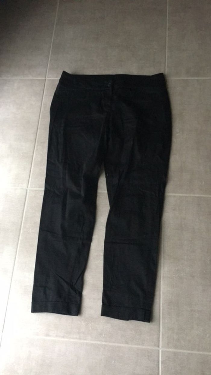 pantacourt noir, matière légère ,longueur cheville ,fausse poche devant derrière . fermeture et bouton .. taille 38