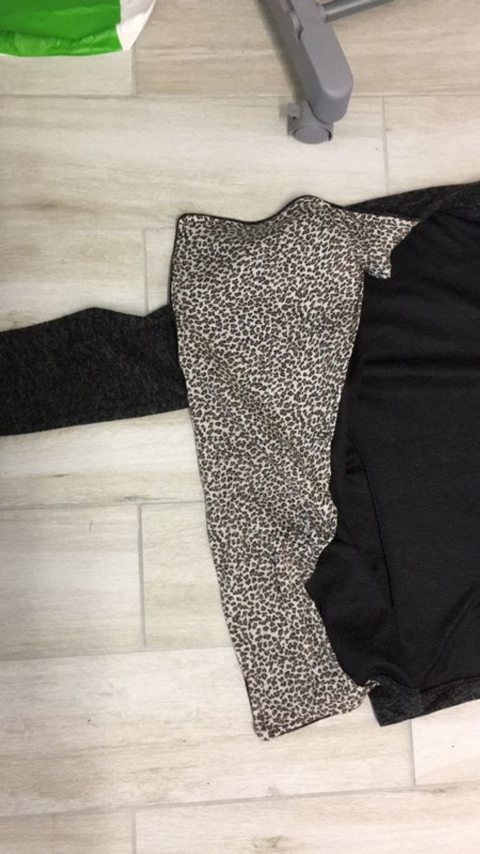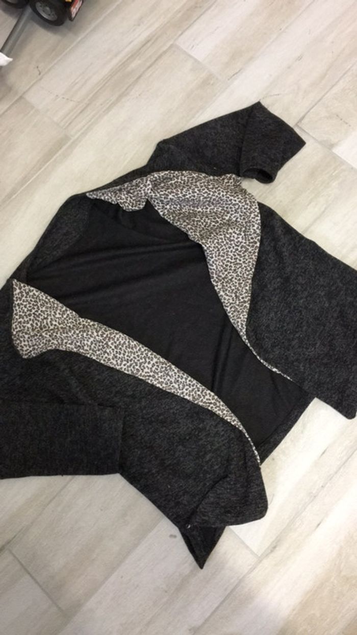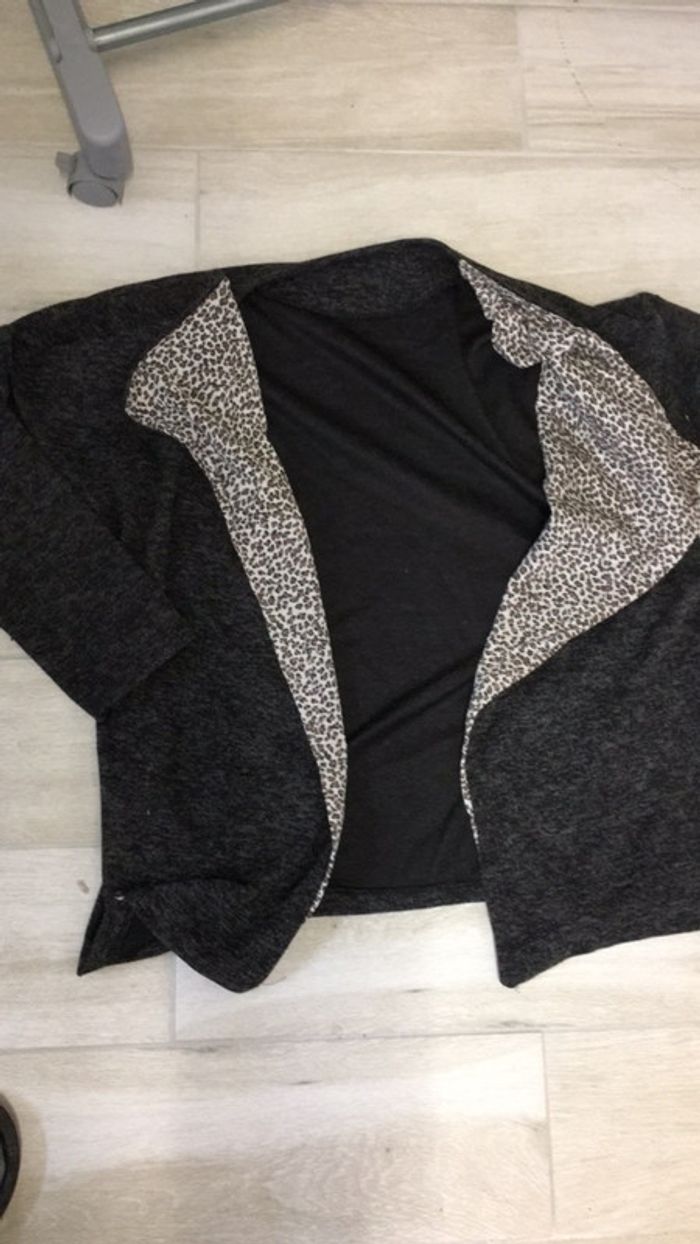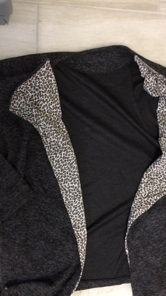 gilet .sans bouton .moucheté gris noir et léopard marron 2 matière 2 couleur