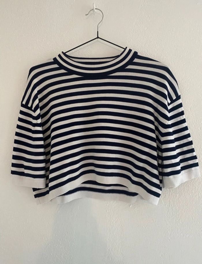 T-shirt court, motif marinière, bleu marine et écru de la marque Zara En parfait état 65 % de viscose, 35 % polyamide Manches courtes Coupe large