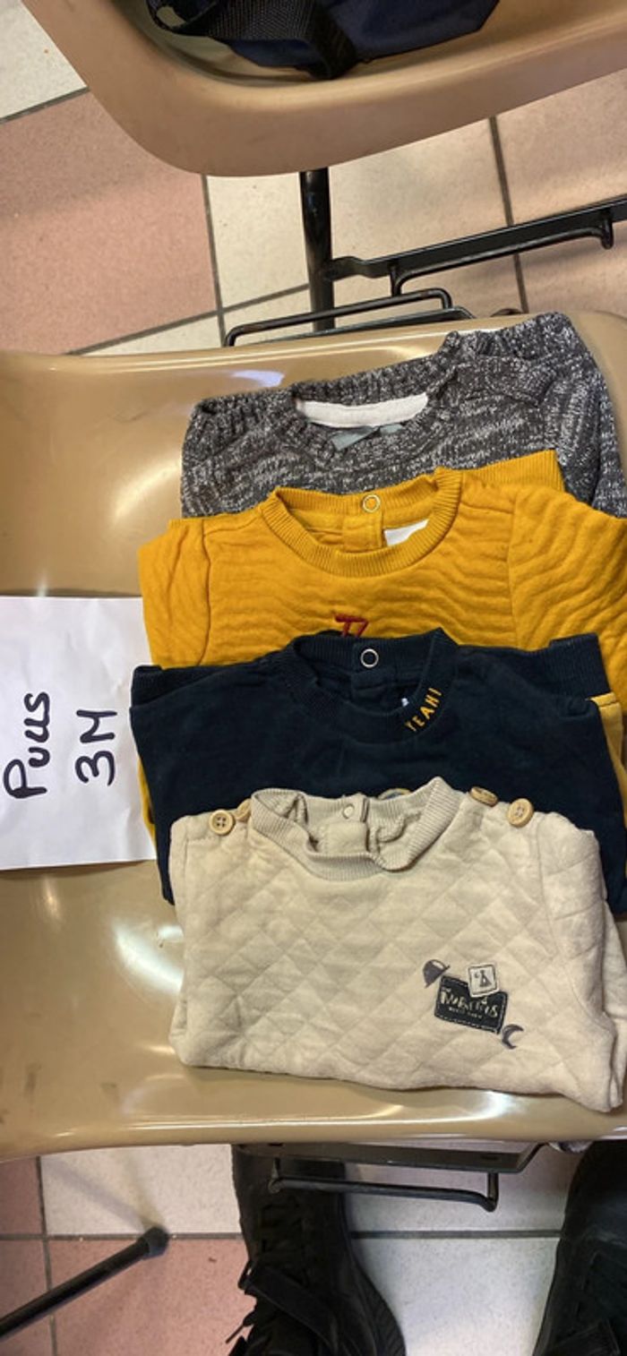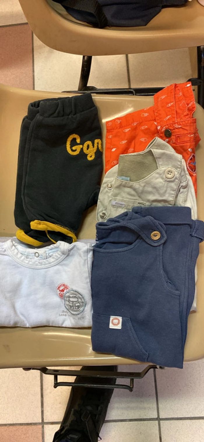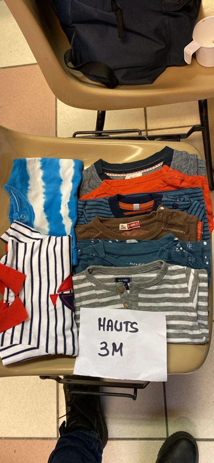 - 4 pulls - 6 bodies - 8 teeshirts - 1 jogging - 4 salopettes - 1 doudoune sans manches Plusieurs marques d’enseignes