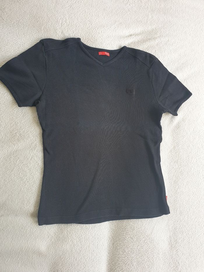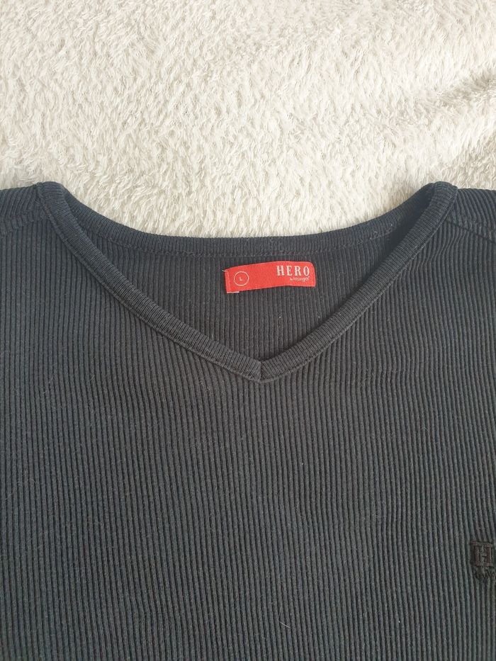 T-shirt homme coton a cotes. L. Assez pres du corps. Col V.