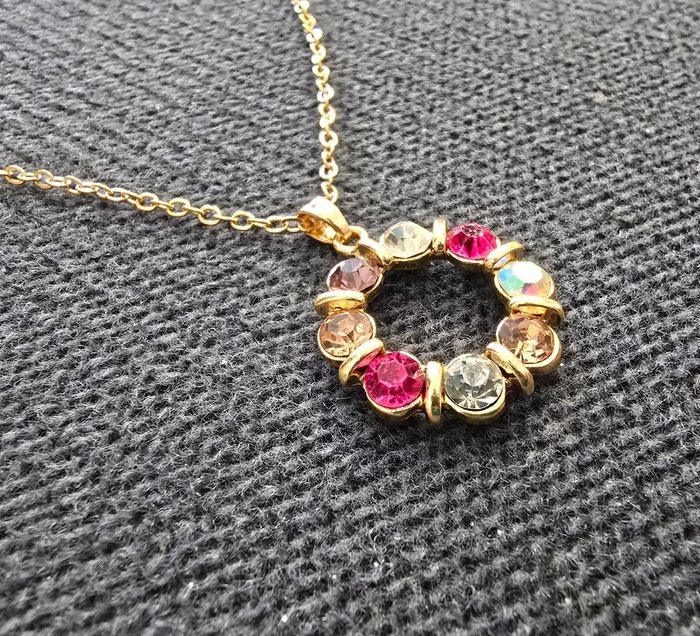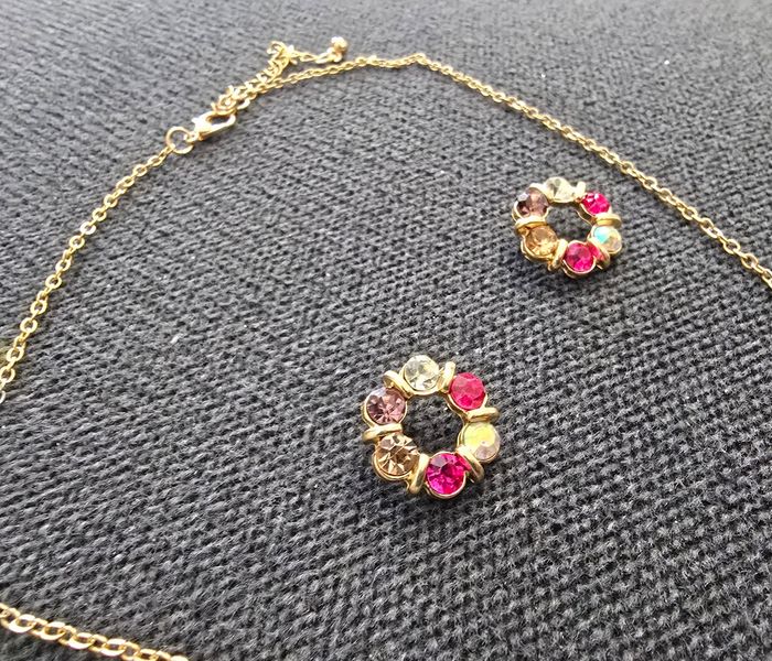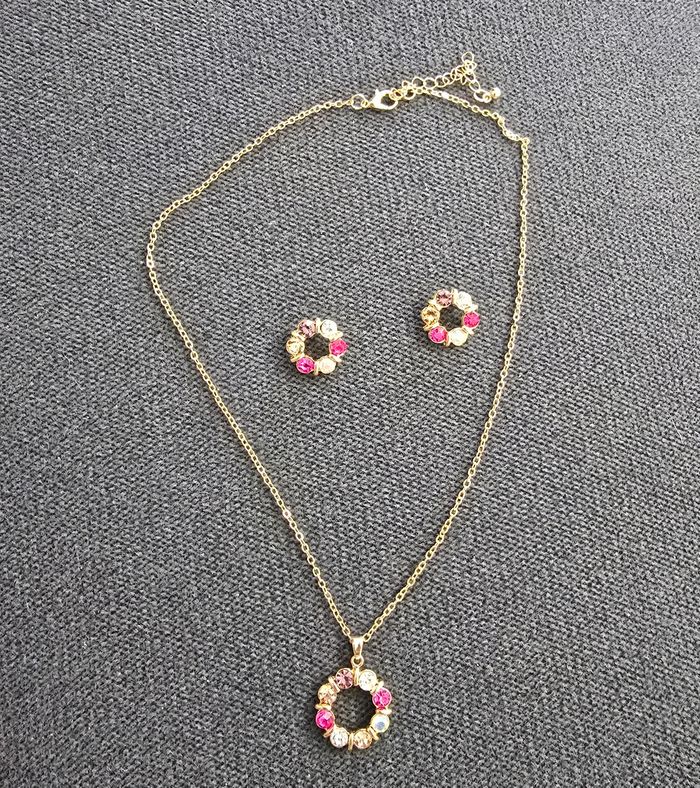 Ensemble bijoux 2 pièces comprenant 1 collier en métal doré avec pendentif cercle sértie de pierre de différents rose. 1 paire de boucles d'oreilles clous en métal doré sertie de pierre de différents rose Idéal mariage ou soiree Jamais porté #parurebijoux #ensemblebijoux #collier #bouclesdoreilles #bijouxfantaisie #bijoumariage #bijousoiree